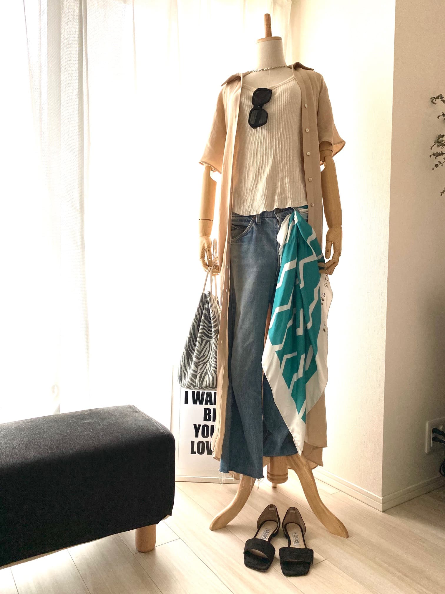 レイヤードスタイルがサマになる骨格だから、タンクトップにリネンのような涼しげな生地のシャツワンピをさらりと羽織るのが正解です。ウエストに爽やか色のスカーフをさらりと巻けば、コーデに夏らしい立体感が。