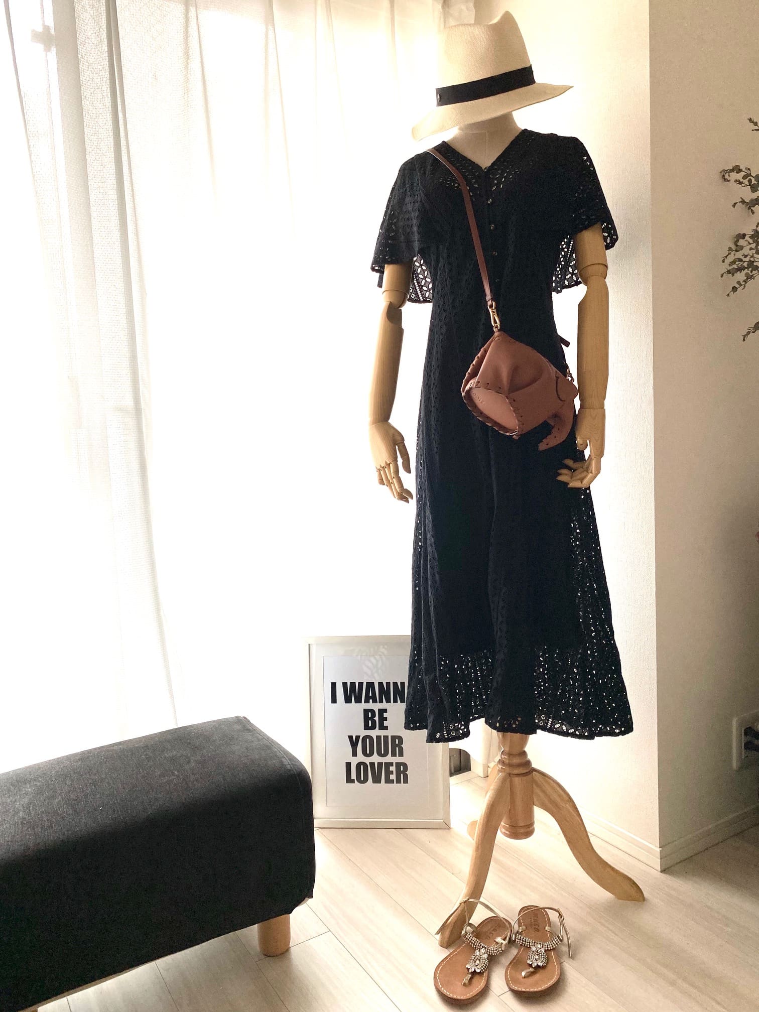 可憐なフレア袖が特徴のレースワンピは、上半身が華奢なウェーブ体型にぴったり。足元はビジューサンダルを合わせることで、華やかさと季節感を両立。日差し対策にもなるハットはカジュアルダウンにも一役買います。