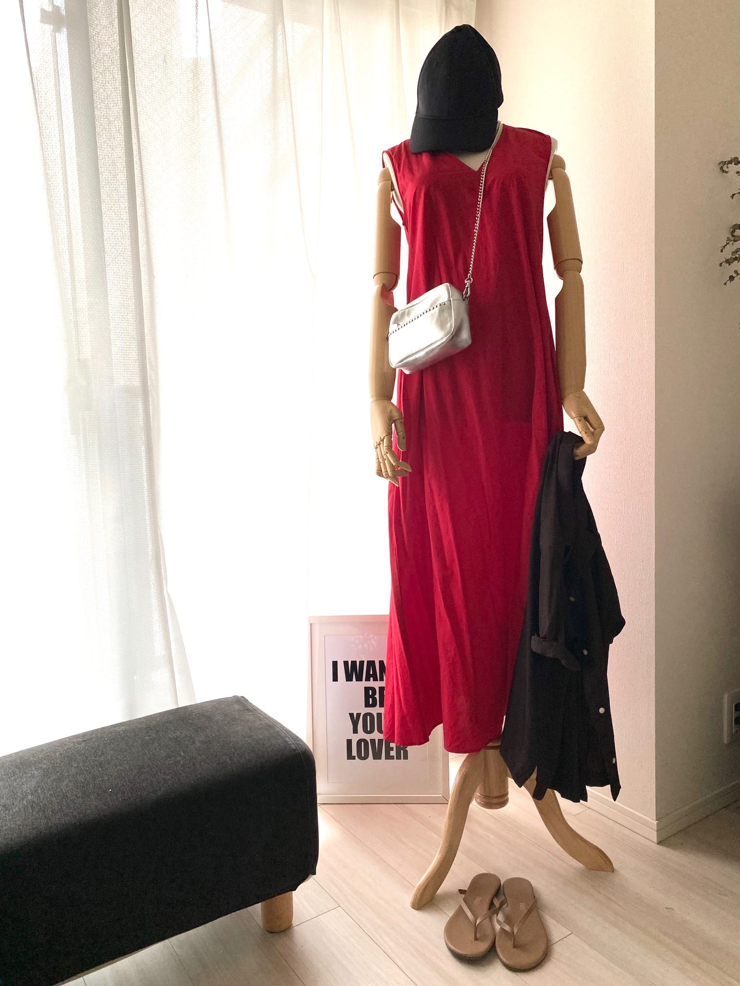 身体に凹凸のあるストレートタイプに似合うのは、ジャストサイズのIラインワンピ。首元がVにあいているデザインならすっきりとした印象に。太陽が味方する〝赤〟をセレクトしてテラス席での時間を盛り上げて。
