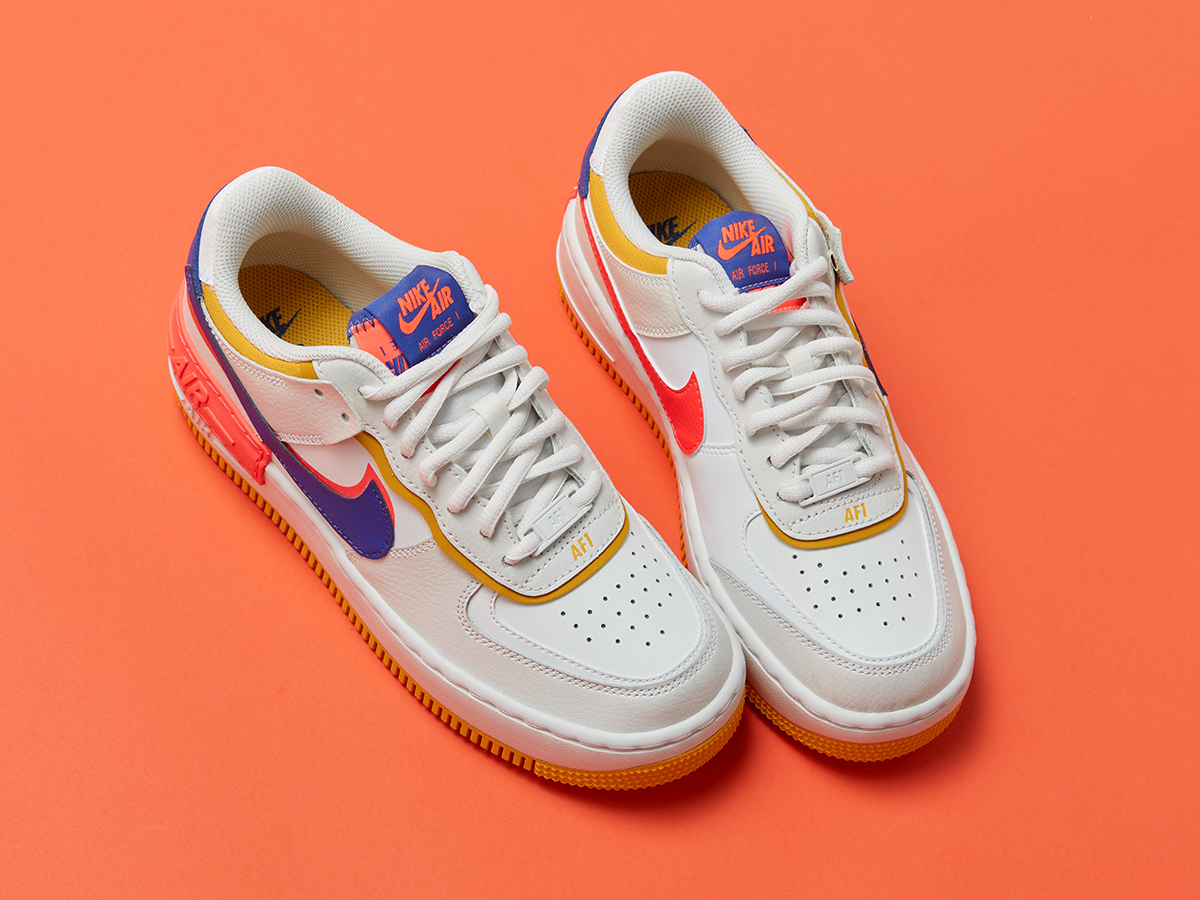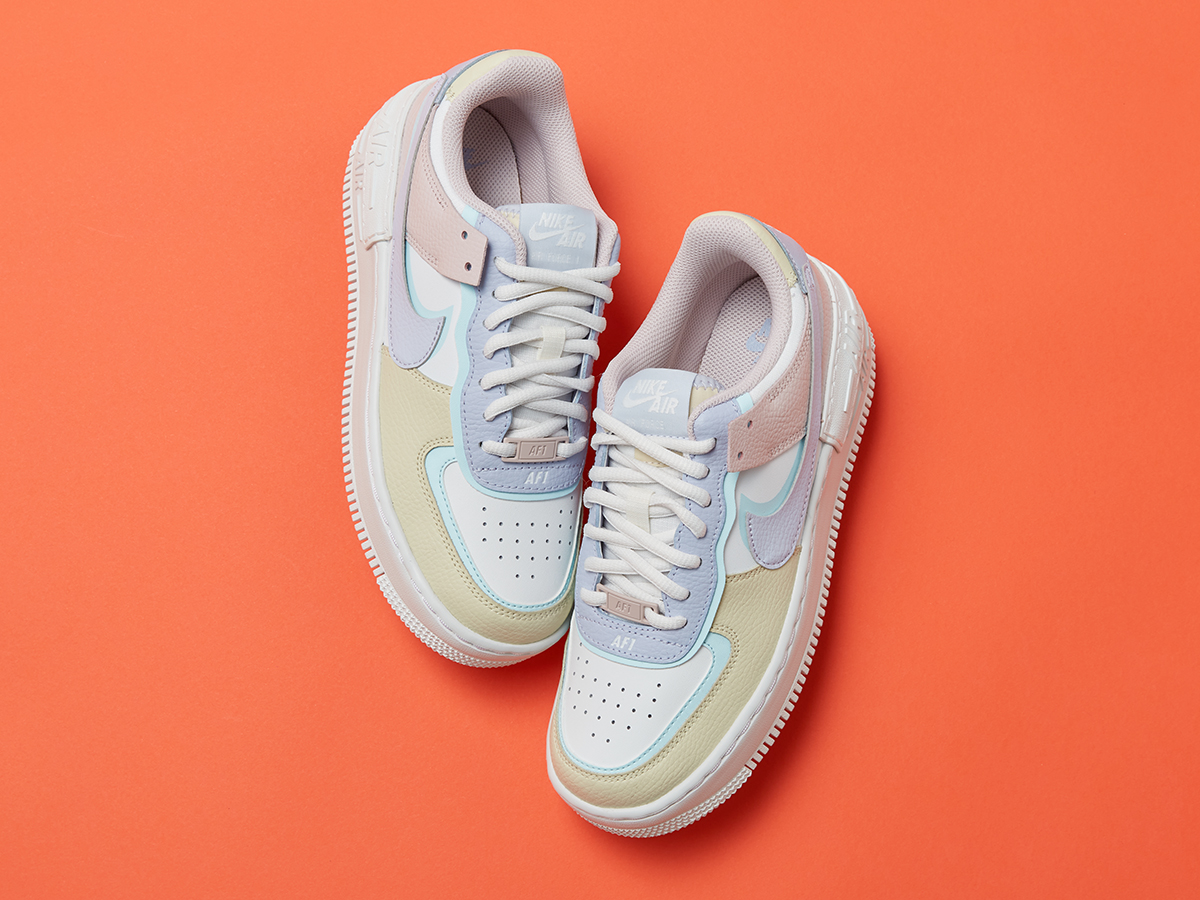 淡いピンクやパープルなど、優しいカラーリングがキュートなこちら。ソールが二重になったデザインが特徴の“エア フォース ワン シャドウ”は、厚底なのに軽量なのが嬉しい。