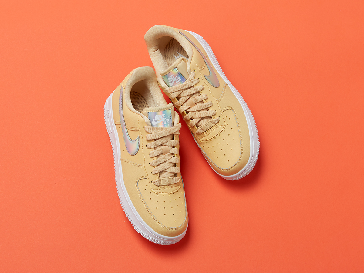 レインボーに輝く“スウッシュ”が目を引くこちら。エア フォース ワンのクラシックなデザインが際立つカスタードイエローが新鮮です。
