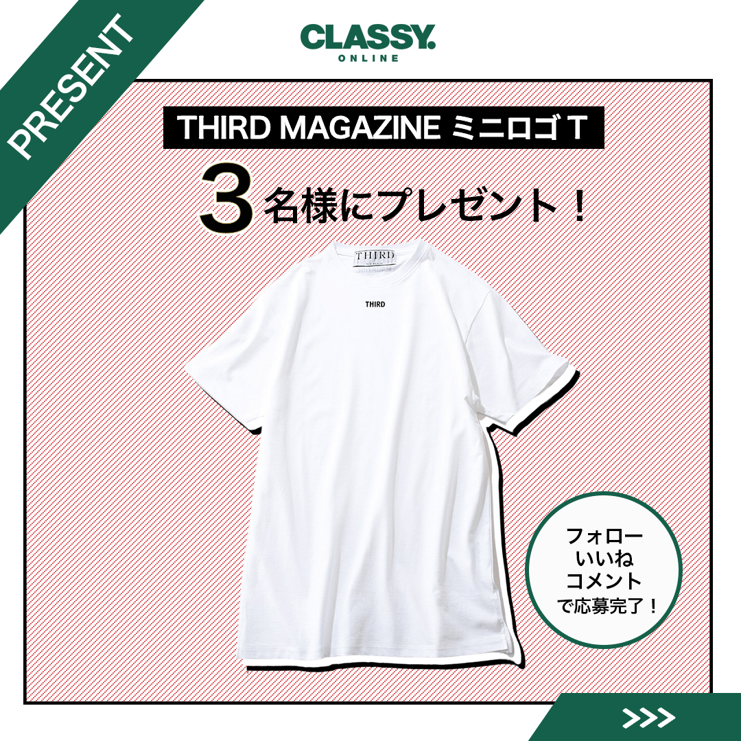 なんと今回、サードマガジンの「THIRD MAGAZINEロゴTシャツ〈ホワイト〉」を3名様にプレゼント!秋冬まで使える注目のオシャレアイテムがゲットできるチャンスです。CLASSY.の公式インスタグラムにて簡単に応募できるので、ぜひチェックしてみて。