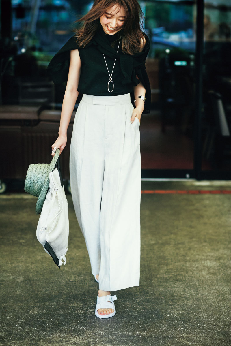 ボリュームのあるワイドパンツ。夏に重宝するリネンカラーは、白のスポサンで足元の色を繋げて分断させないことで、重心アップ。脚長効果を引き出せます。