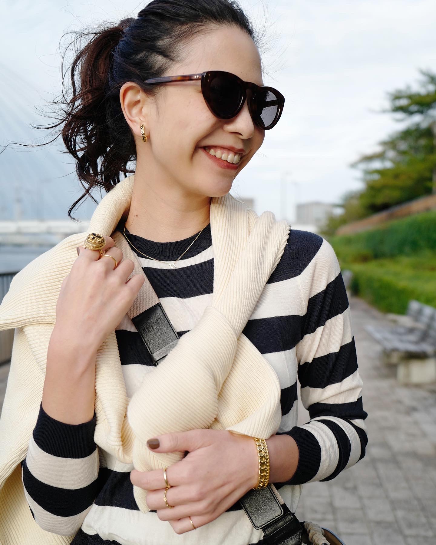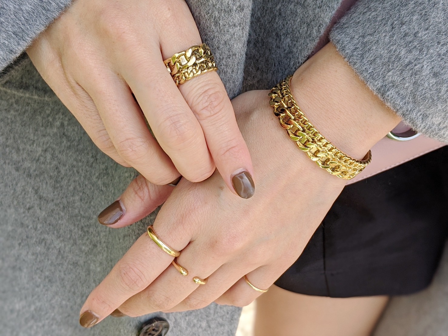 アクセサリーはゴールドで女性らしく。右手のリングとバングルは“gren”のチェーンシリーズで統一しました。ネイルは秋らしくブラウンに変えて、ヴィンテージシックに。