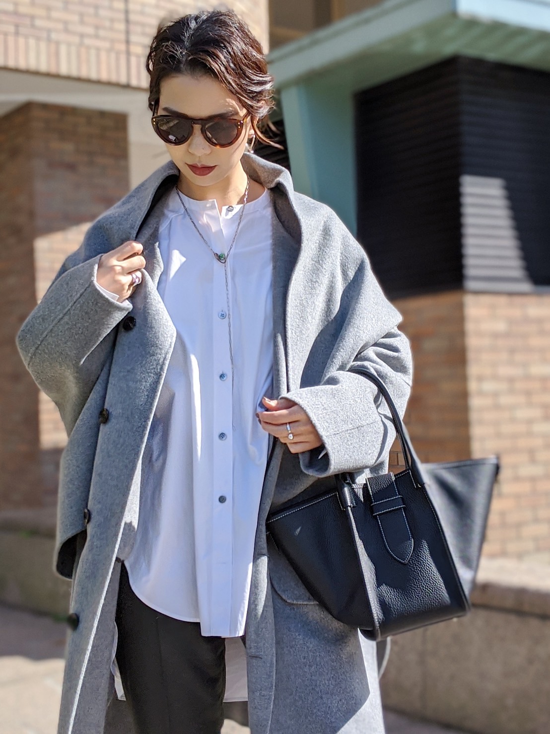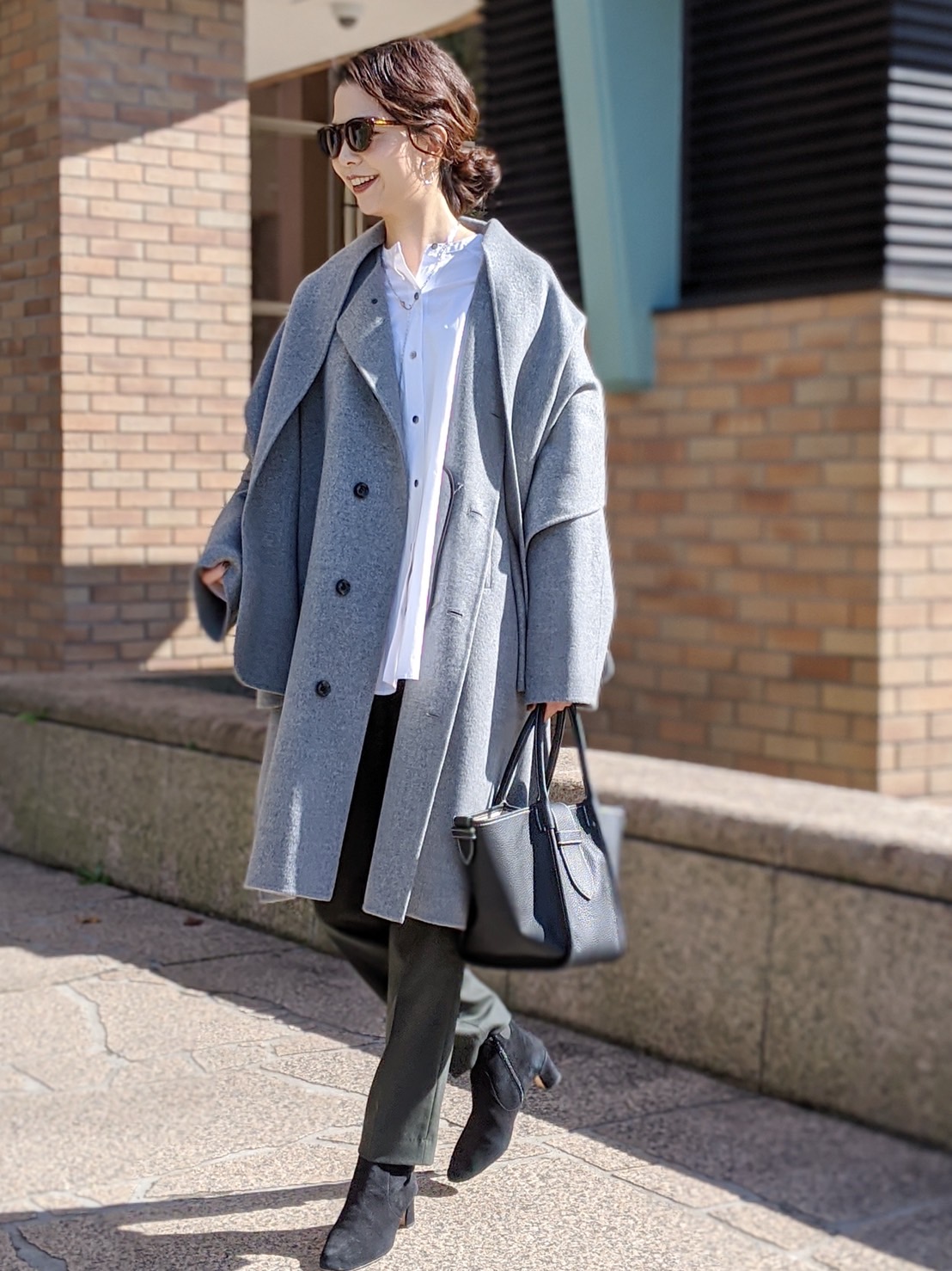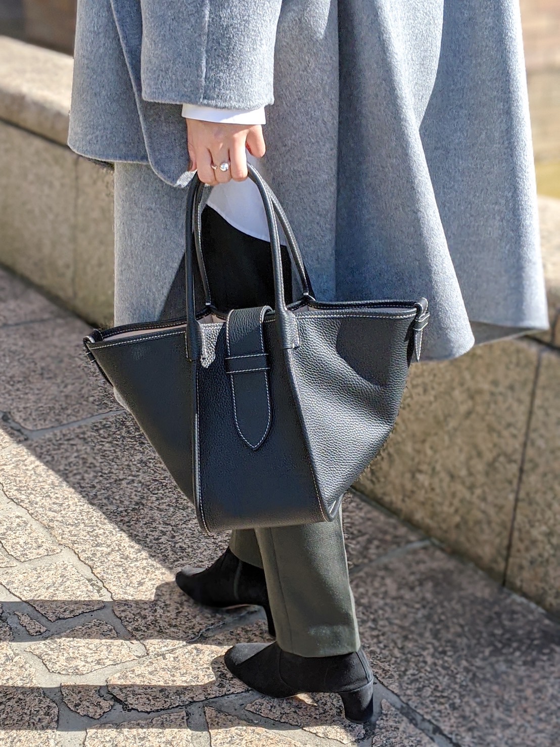 仕事日を想定したコーディネートなので、黒の大きめのバッグを合わせました。靴とバッグの色を合わせるとコーディネートに統一感が出ます。