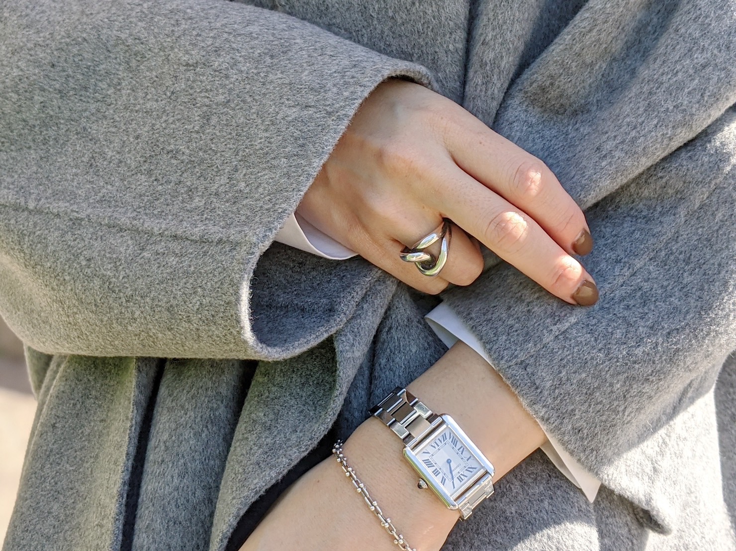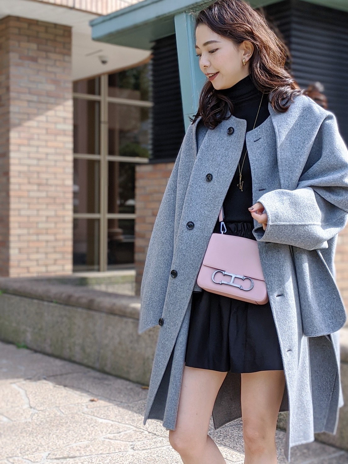 アクセサリーはシルバーをチョイス。グレーのコートとシルバーのアクセサリーは相性GOODです。