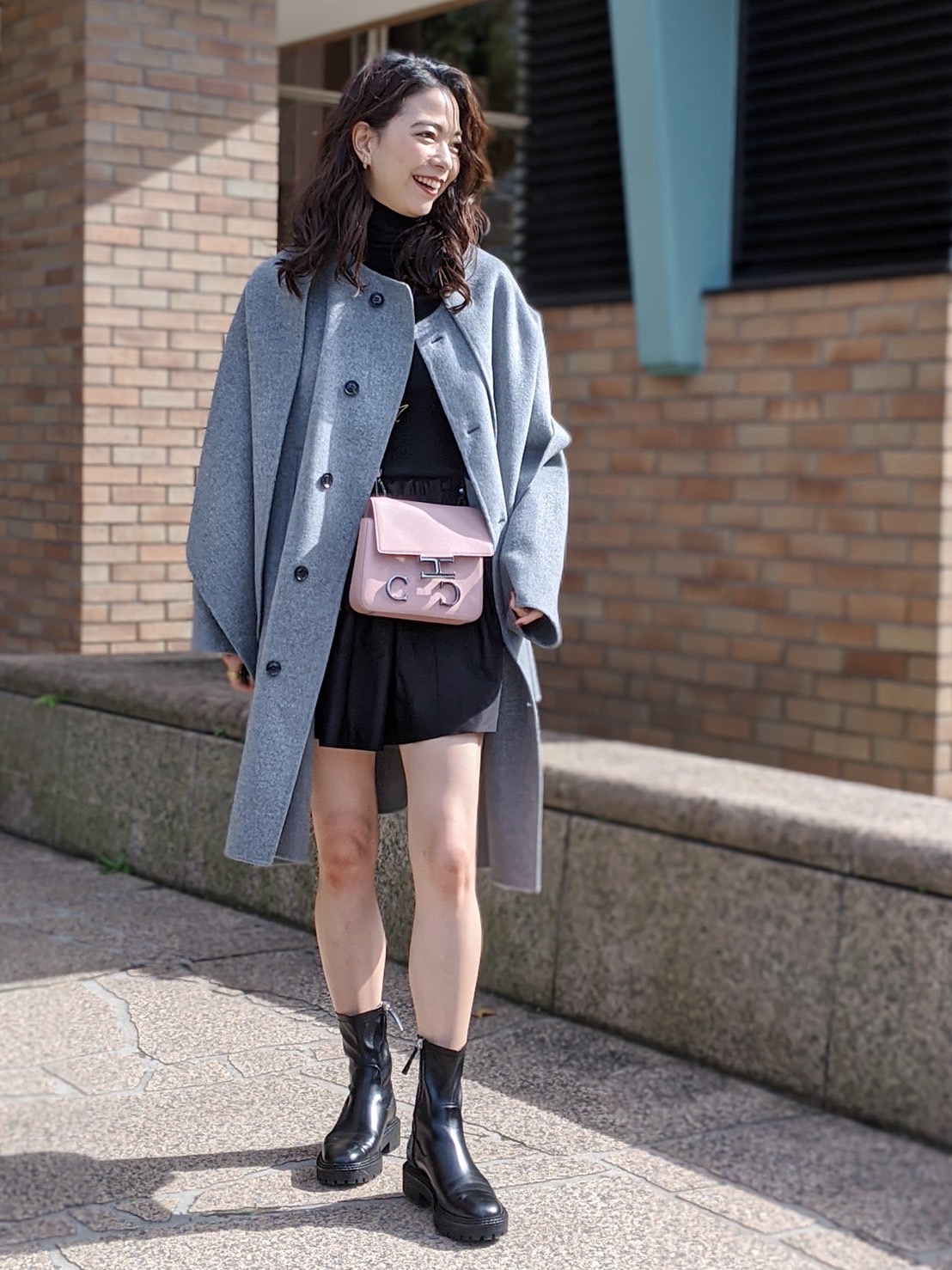 ミニスカートがインパクト大なので、トップスはベーシックな黒のタートルニットをチョイス。バッグは休日らしく、ショルダーに。モノトーンコーディネートにはカラーの差し色が必須です!
