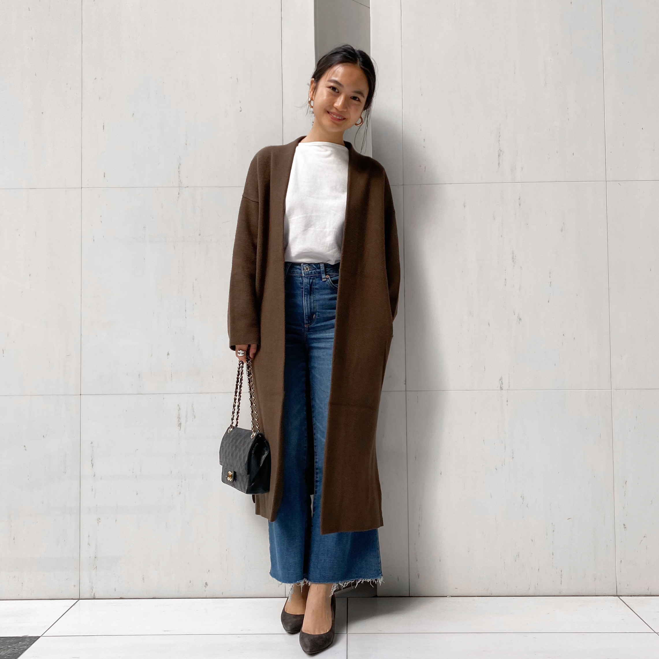 私の場合、これまで秋のアウターはトレンチコートを着ていることが多かったですが、通勤がなくなった今年はもっとカジュアルダウンしたくて、ロング丈のニットコートを新調しました。
