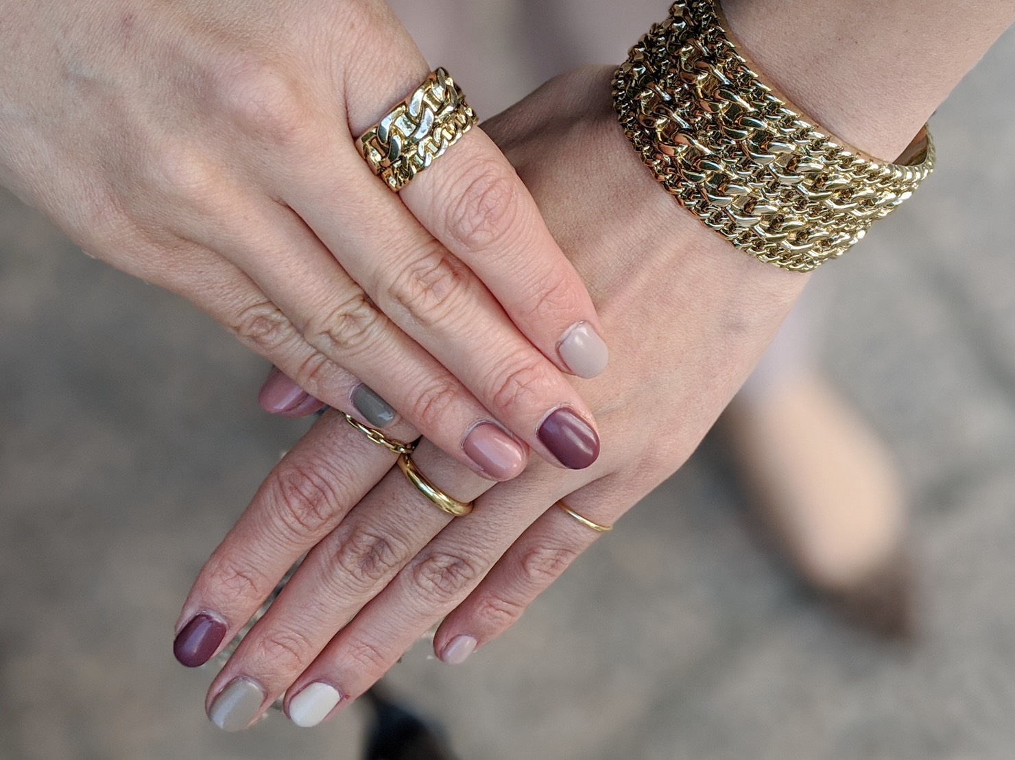 ネイルとパンツの色がリンク♪ジュエリーはゴールドをチョイスし、grenのチェーンシリーズのアイテムを主役にしました。