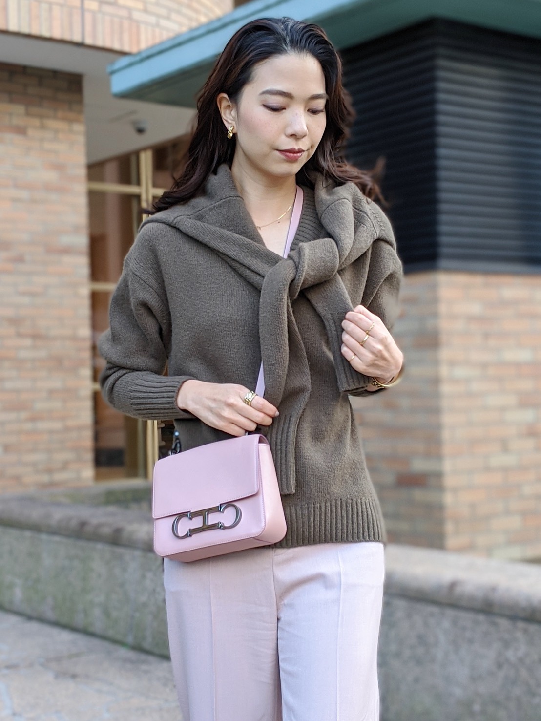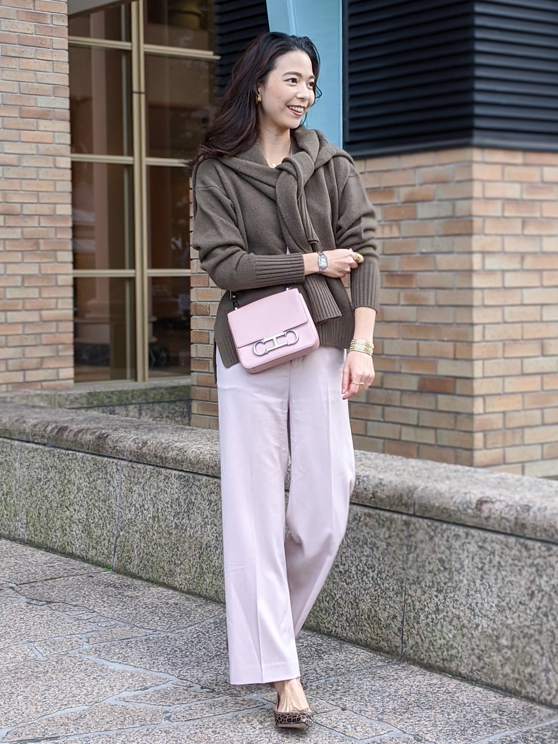 カーキのクールカラーのニットなので、パンツとバッグはレディにピンクをチョイス。ショルダーバッグを合わせてオフの日をイメージしました。