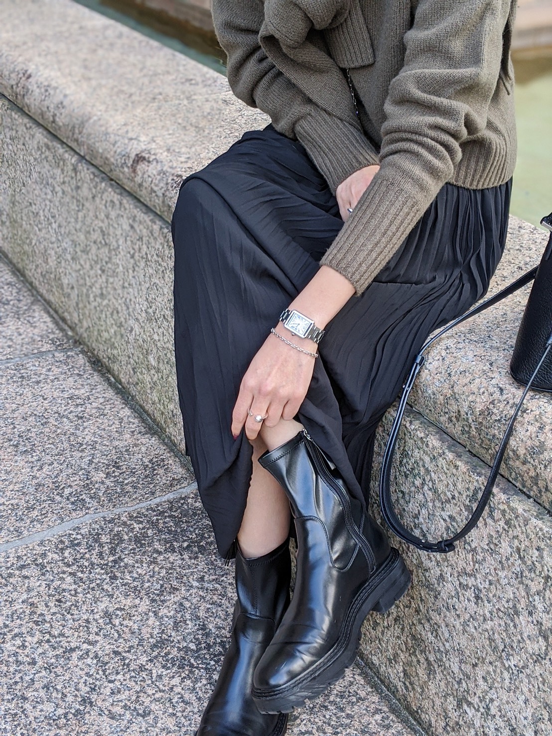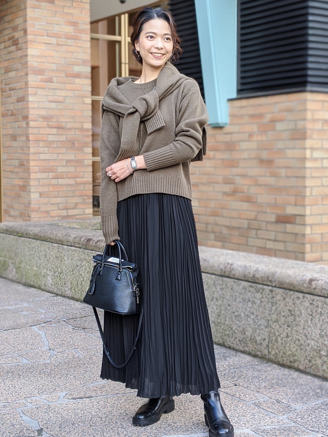 ロング丈のプリーツスカートに、今年らしいぽってりとしたブーツを合わせて、モードなスタイリングにしました。