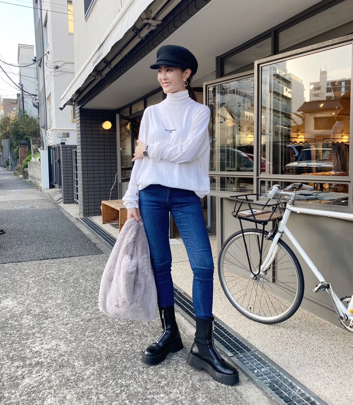全身のコーデはこのような感じです。ニットがゆったりとしているので、ボトムはスキニーを合わせました。シンプルなコーデなので、大きめのもこもこバッグやキャスケットを合わせたりして工夫しています。