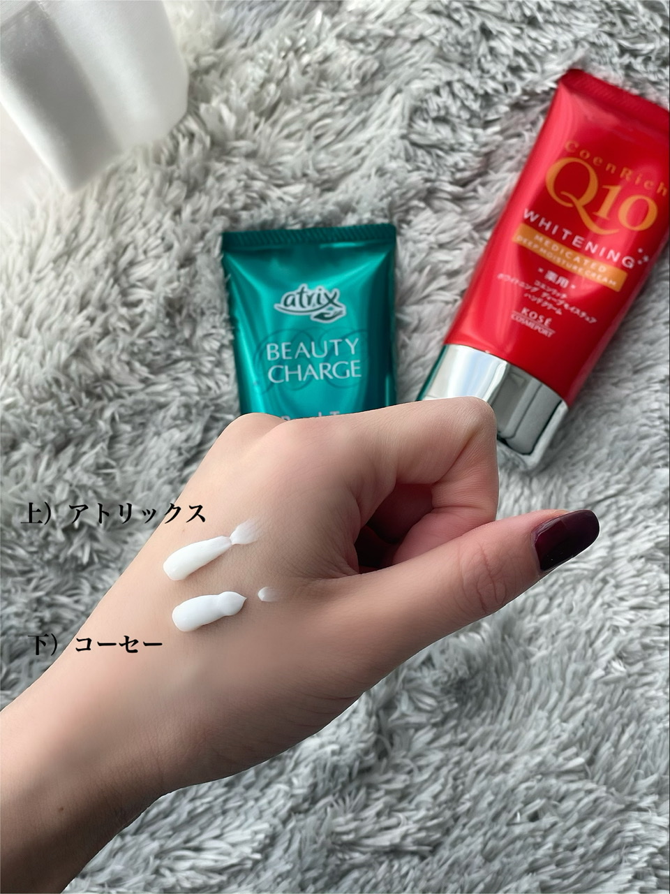 そして、もう一つはコーセーのコエンリッチQ10。こちらはディープモイスチュアなだけあって、こってりしたクリームで付けた後は薄い膜が張っているような感じです。保湿力こそ抜群ですがベタつきがあるので、パック感覚で寝る直前につけています。