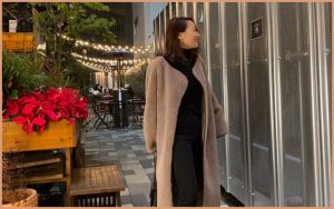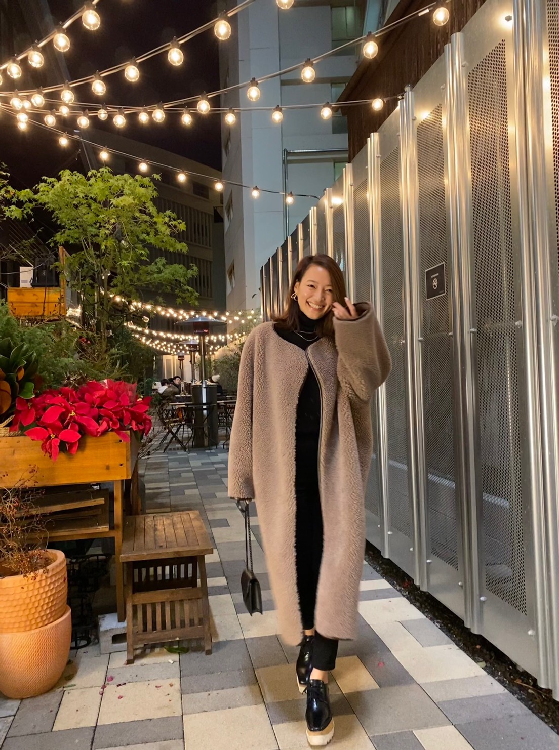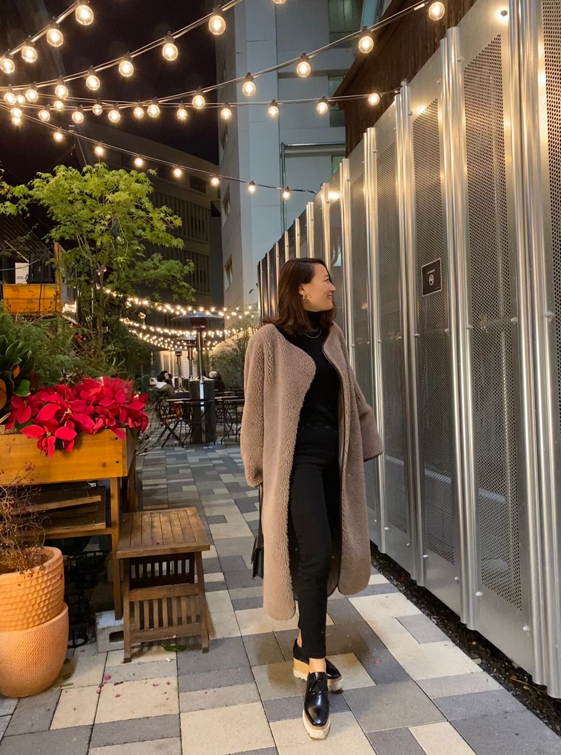 3. ブラックコーデにブラウンのボアコートで今っぽく!