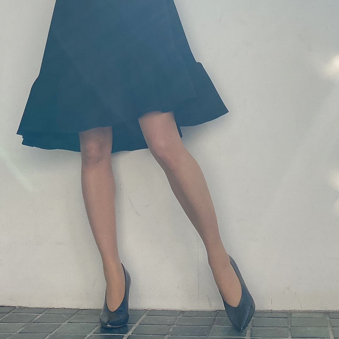 1枚目は黒タイツとフラットシューズ合わせですが、
