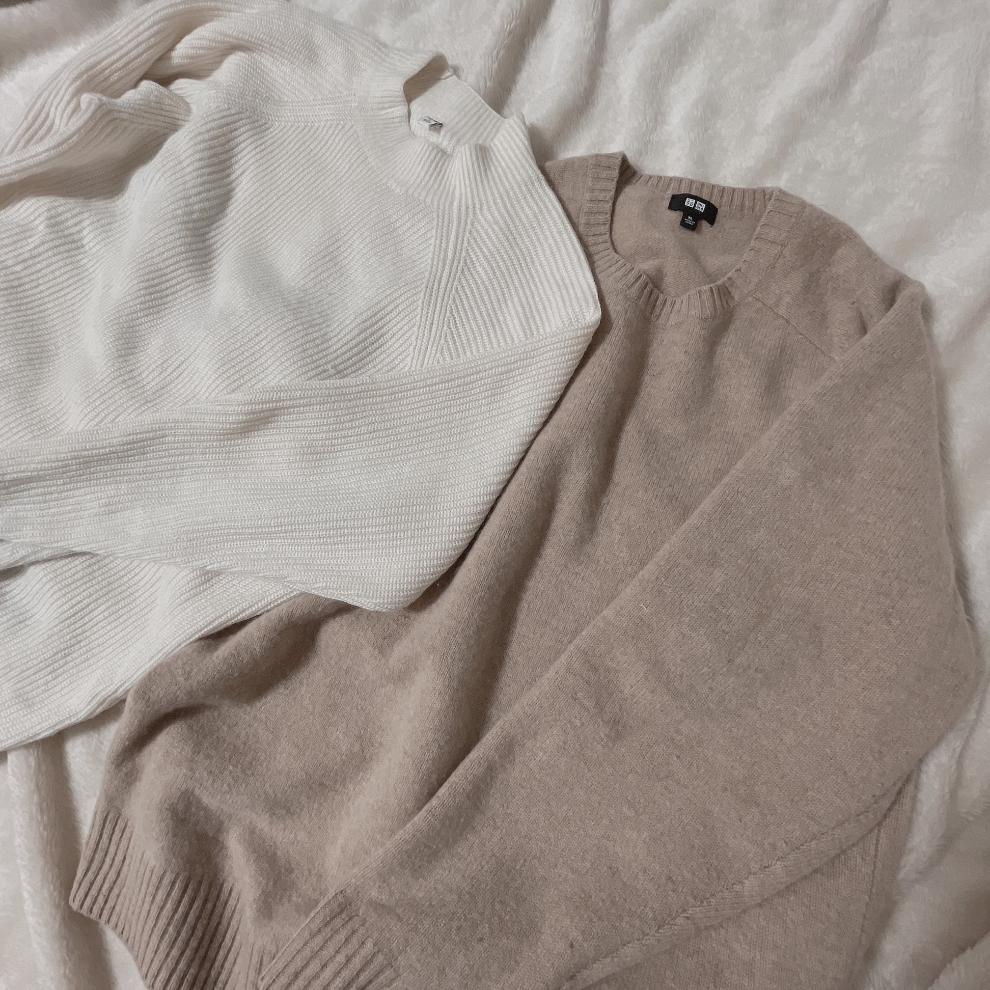 左: ウォッシャブルミドルゲージクルーネックセーター(Lサイズ) / UNIQLO