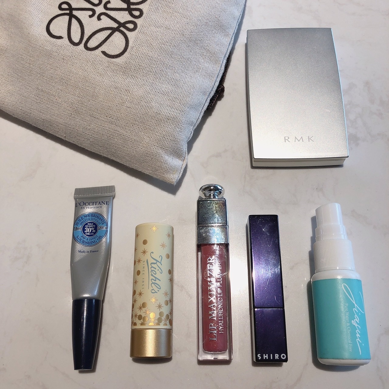 左からネイルオイル(ロクシタン)、リップ(キールズ)、マキシマイザー(ディオール)、口紅(シロ)、消毒液、お粉(RMK)です。
