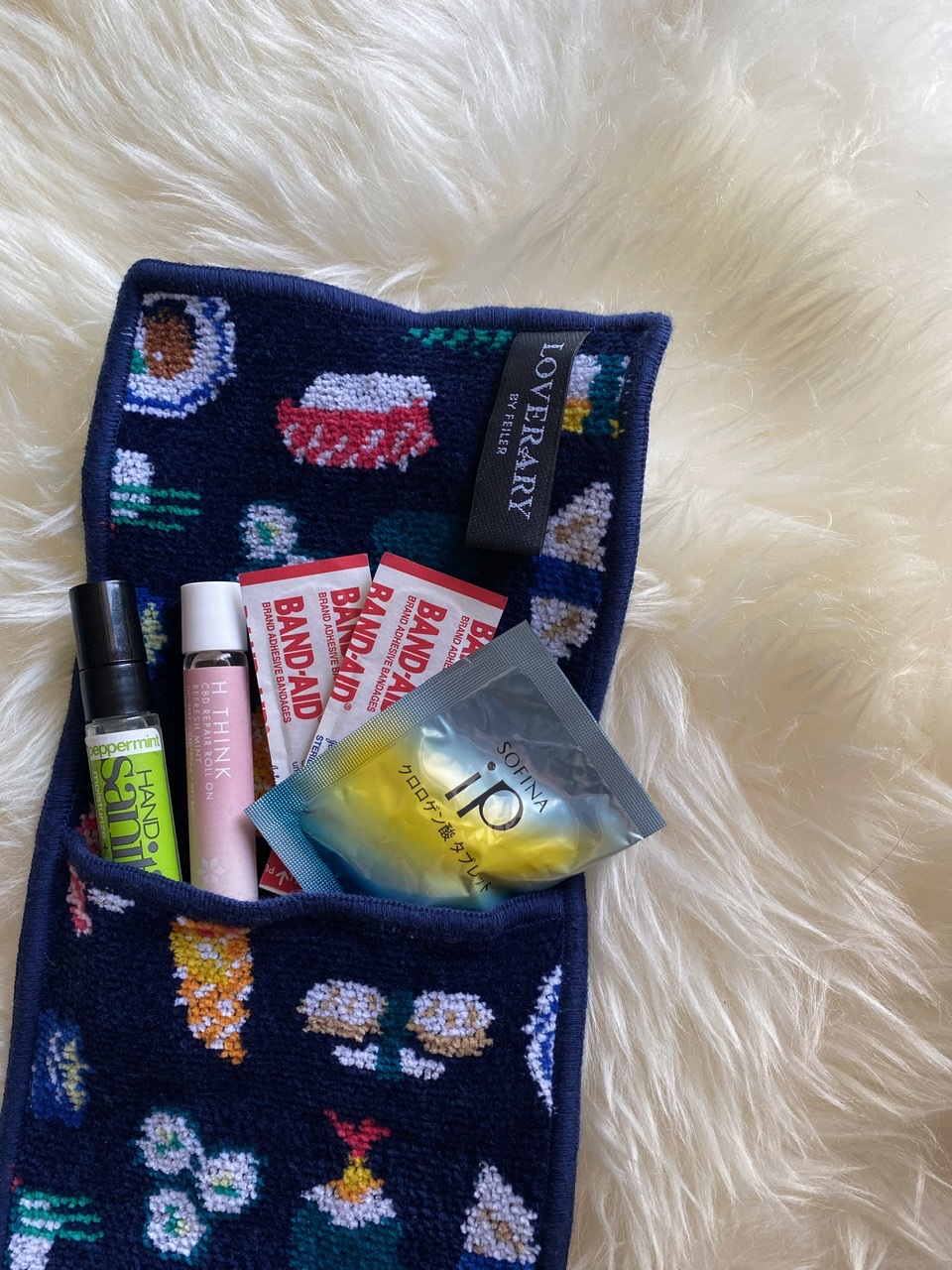 ハンカチポーチにはこれまた必要最低限の小物たちを。アルコールハンドスプレー、ロールオンのCBDオイル、バンドエイド、サプリメント。