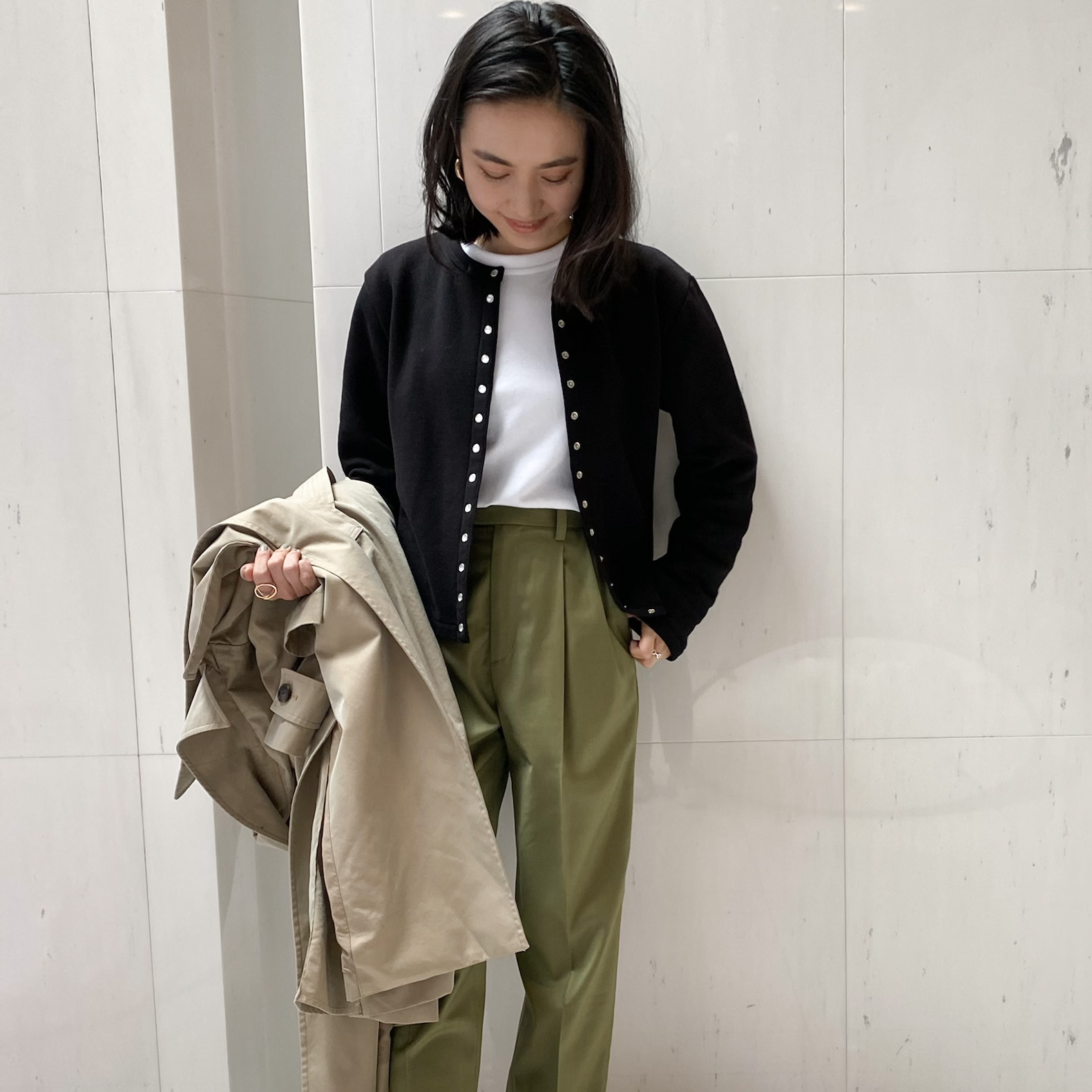 ボタンのデザインが可愛いアニエスべーのカーディガン。ベーシックなコーディネートのポイントに使いたくて、購入しました。カジュアルなデニムにも、今回のような綺麗めなパンツにも合わせやすい万能アイテムです。もう少し暖かくなったらコートを脱いで、こんな感じで白Tの上にジャケット感覚で羽織りたいと思っています!