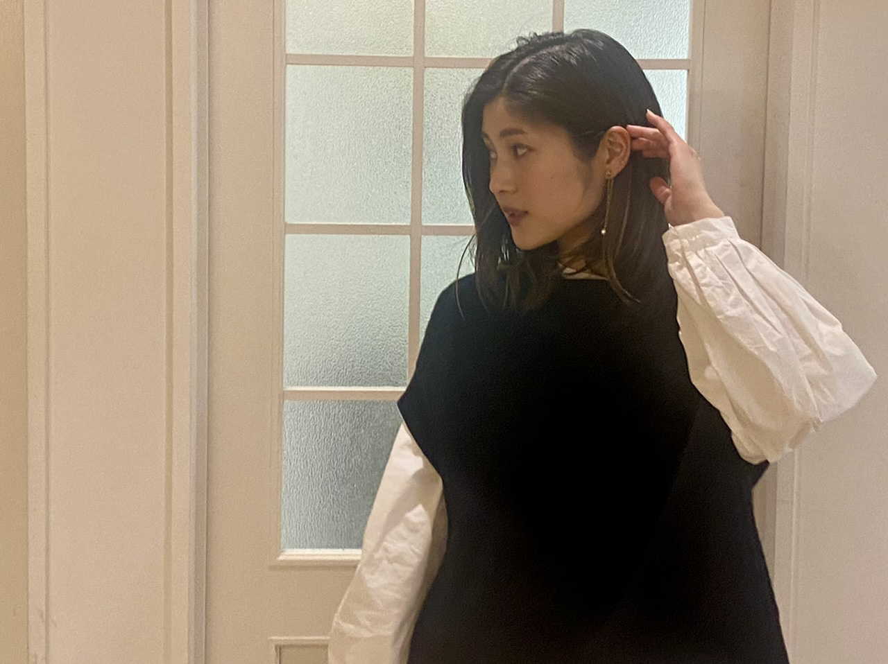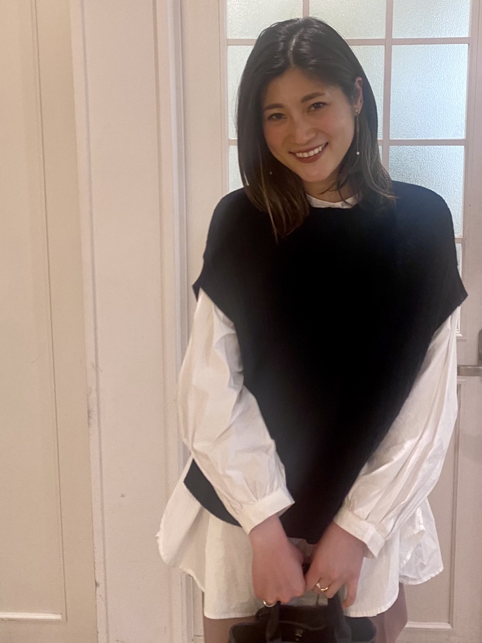 白シャツ×ニットは、スナイデルのセットのもの。ニットベスト単体でも使えるので、ブルーやベージュのシャツやブラウスに合わせて楽しんでいます。