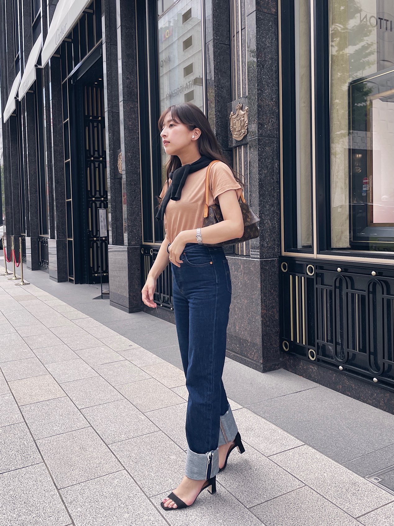 銀座という土地柄に合わせ少し上品な着こなしをしたいなと思い、コットン製で艶感のあるなめらかなTシャツと、デザインの効いたロールアップデニムをチョイス。