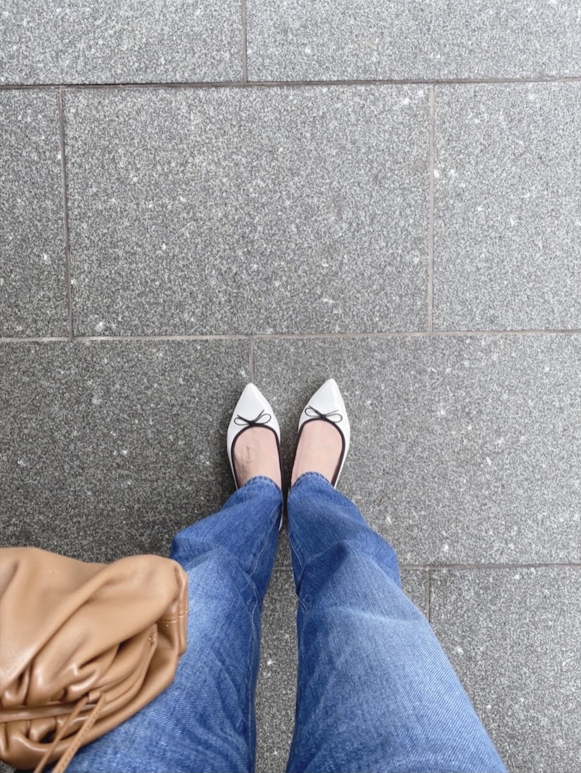 ポインテッドトゥのフラットシューズです。カラーはホワイトにしました。リボンがブラックでバイカラーなので、色んなコーデに合わせやすくて気に入っています!
