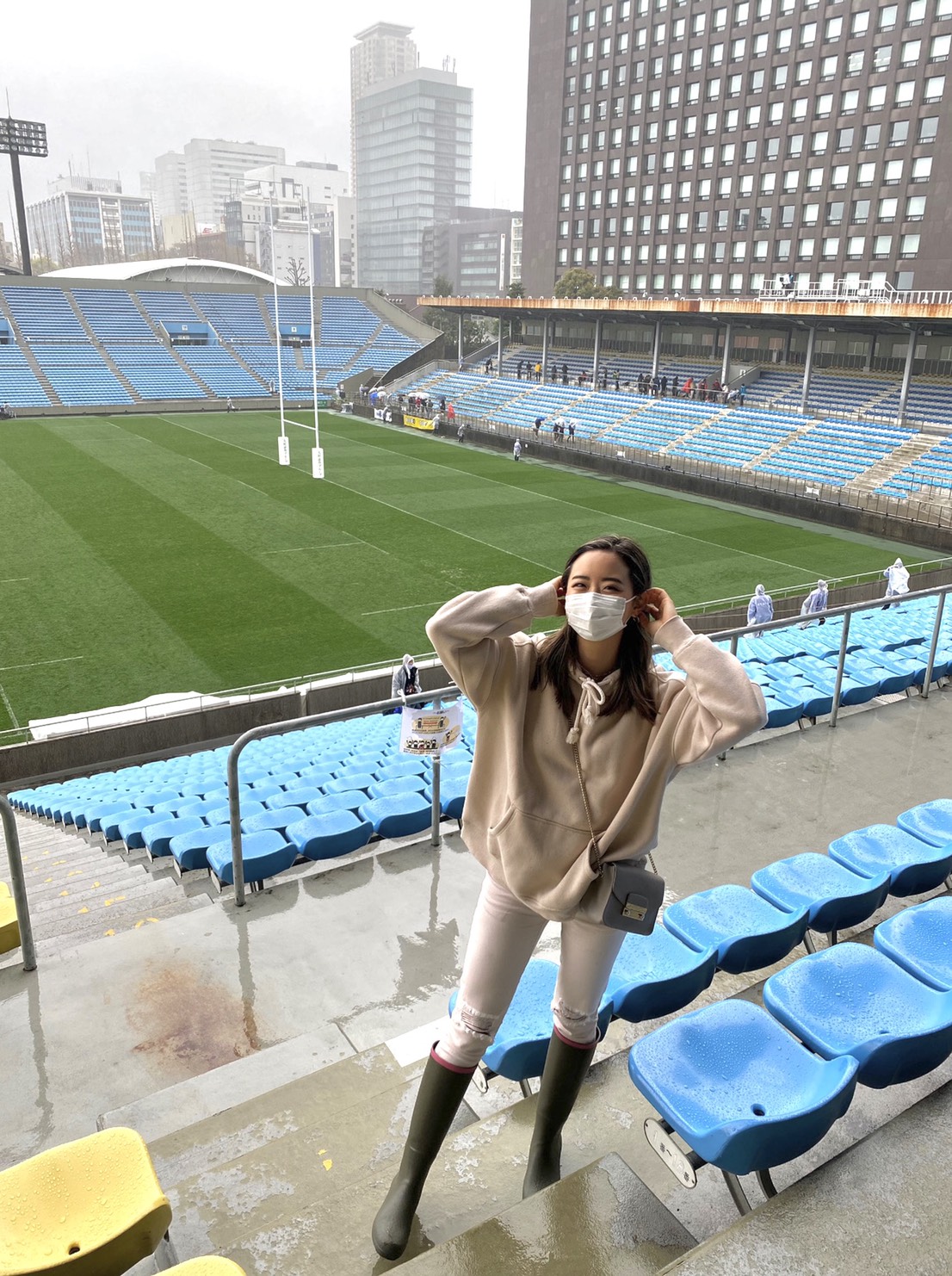 大好きなラグビー観戦も、雨の時はもちろんレインブーツ!試合中は傘をさすことができないので、レインブーツとレインコートが必需品なのです。AIGLEのレインブーツは膝下までしっかりと覆われるロング丈がポイント。