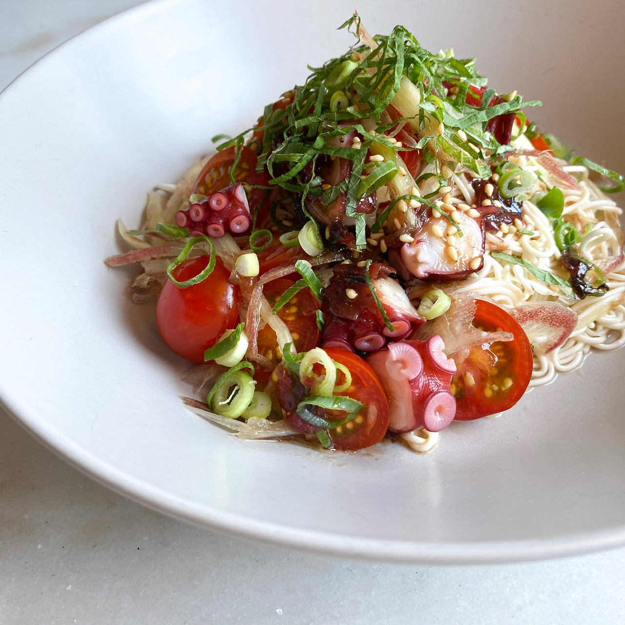 ②タコは一口サイズに、ミニトマトは半分に、みょうがはせん切りにし、お皿のそうめんの上にのせる