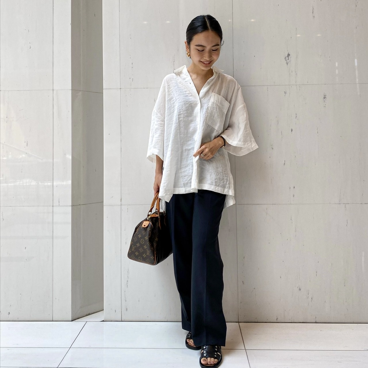 ゆったりとしたサイズ感が、今の気分にもぴったりな白シャツを見つけました! 159cmの私はXSを着ています。シワ感のある柔らかい生地が少しリラクシーな雰囲気なので、黒いパンツと合わせてもかっちりしすぎず、程よく抜け感を出せるかと思います。(アイロンいらずなので便利です!)