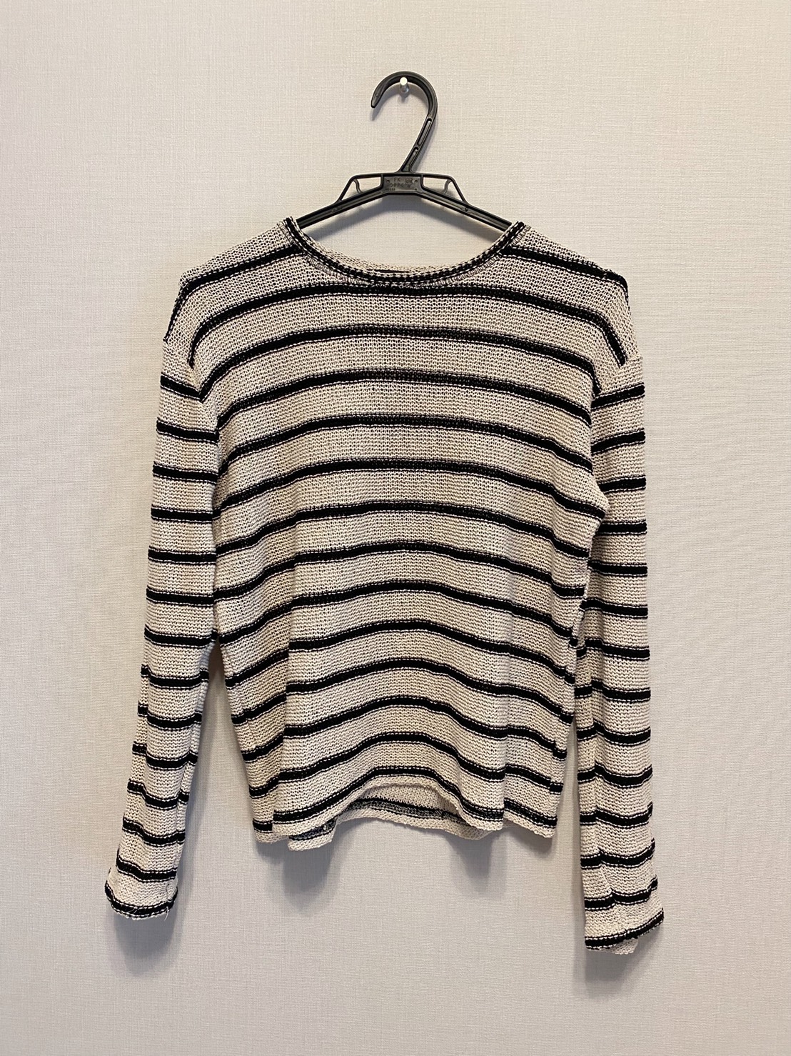 ややオーバーサイズのセーター。透け感があるので、長袖ですが今の季節から着られそうです。ボーダーはコーデのアクセントになるので一枚持っていると便利♩