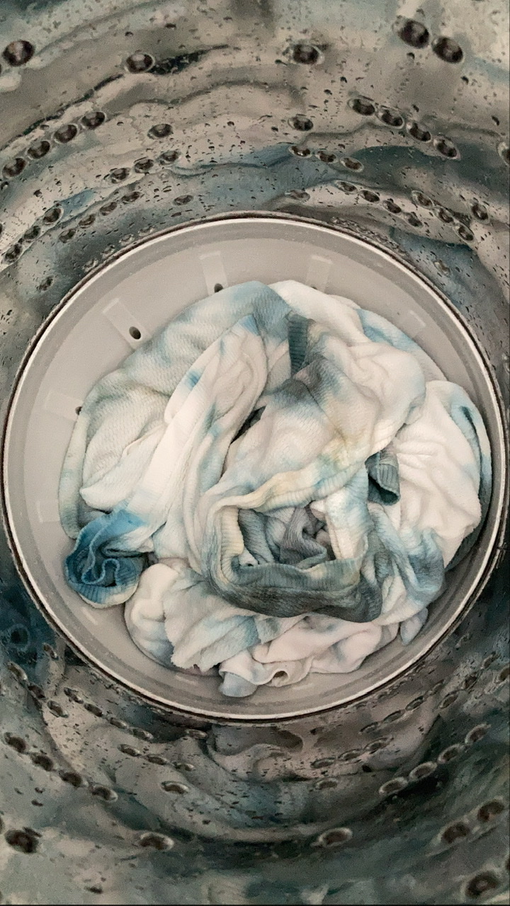 色を濃く残したい場合は水洗い、少し薄くしたい場合は洗剤で数回洗い、しっかりと乾かします。今回は使用していませんが、染色後の色止めにカラーストップを使うと、色落ちを防止してくれます。