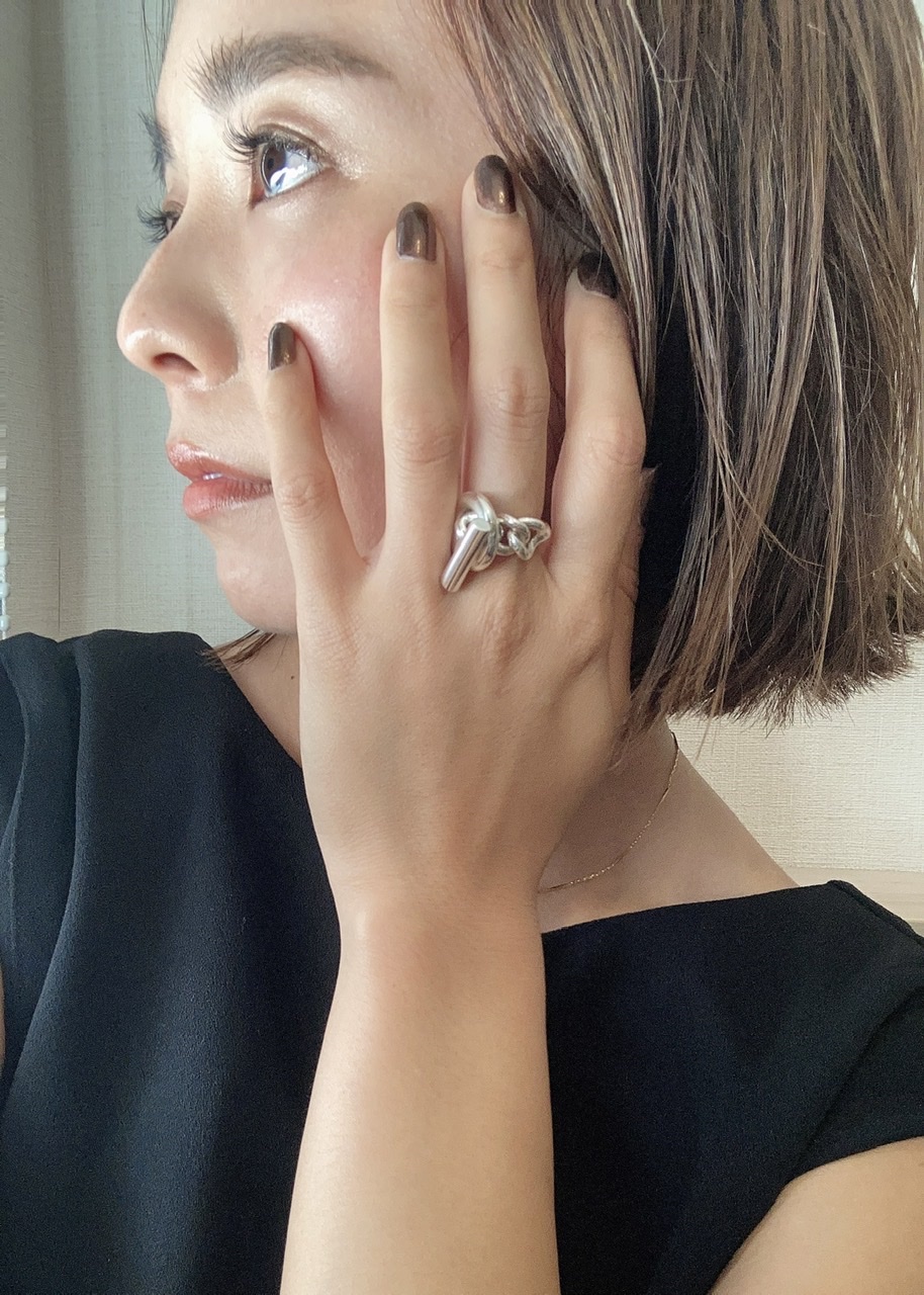 ごつめで一見辛口にみえるリングですが、フェミニンにもレディにも様々なスタイリングを邪魔せず彩る、万能リングだと思っています!