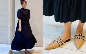 足元はパールのついた甘辛デザインのスリッパをセレクト。こちらもZARAのセールで購入したものです。男性ウケはいまいちですが(笑)、個人的にはかなり気に入っている一足です。