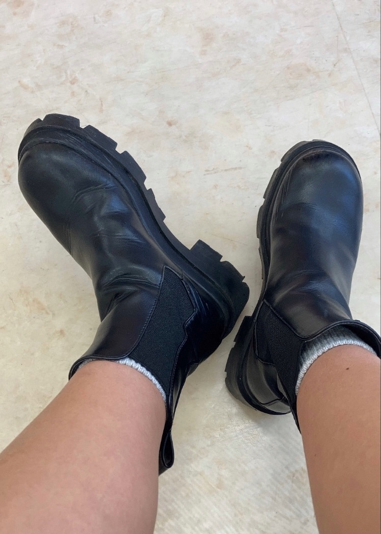 ZARAのトラックソールブーツ。昨年購入したものですが、今年も引き続きボリュームソールのブーツがトレンドなので重宝しています。サイドゴア風の切り替えデザインや、足首がきゅっと細く見えるようなくびれシルエットのおかげで、辛口すぎずキレイめなスタイルとも相性抜群。