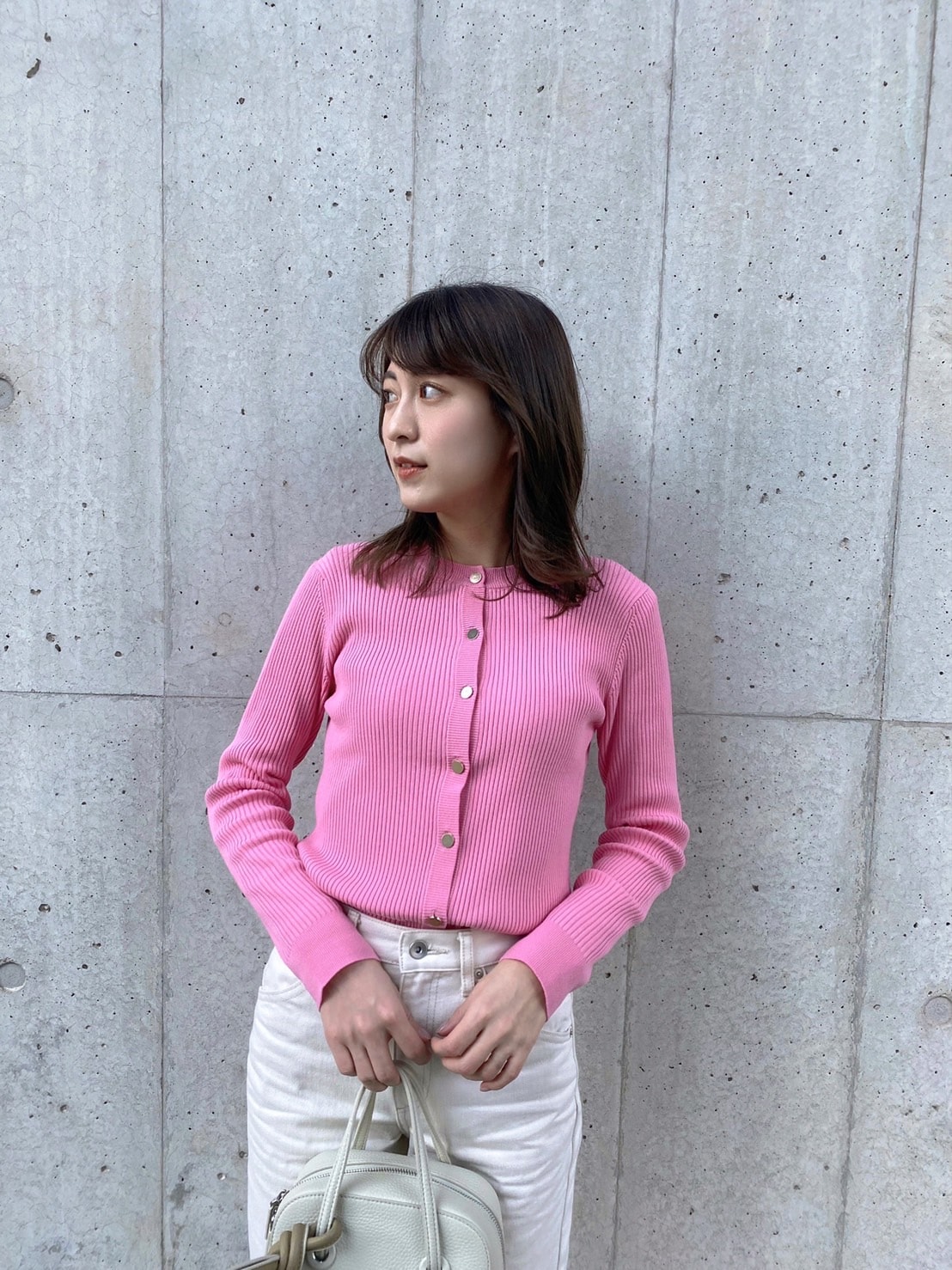 allureville(アルアバイル)のカーディガン。鮮やかだけどビビッド過ぎないピンクに惹かれて購入しました。