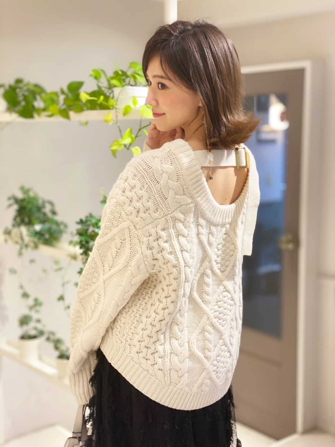 前から見ると清楚ないい子コーデですが、コートを脱いだ瞬間、背中が見えてとってもセクシー。