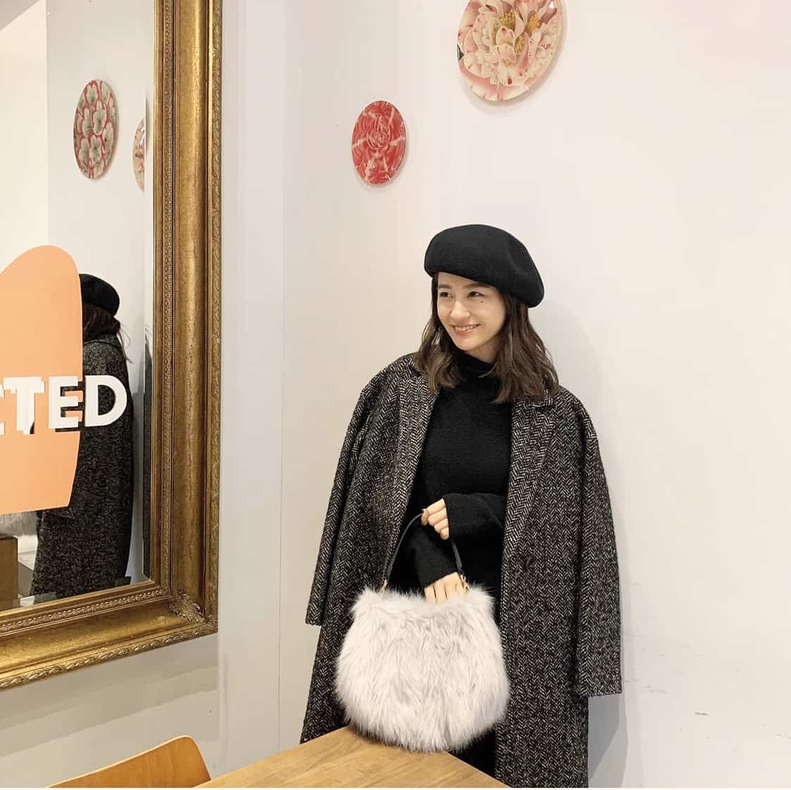 ブラックのコートを羽織るとモノトーンでシンプルな印象に。