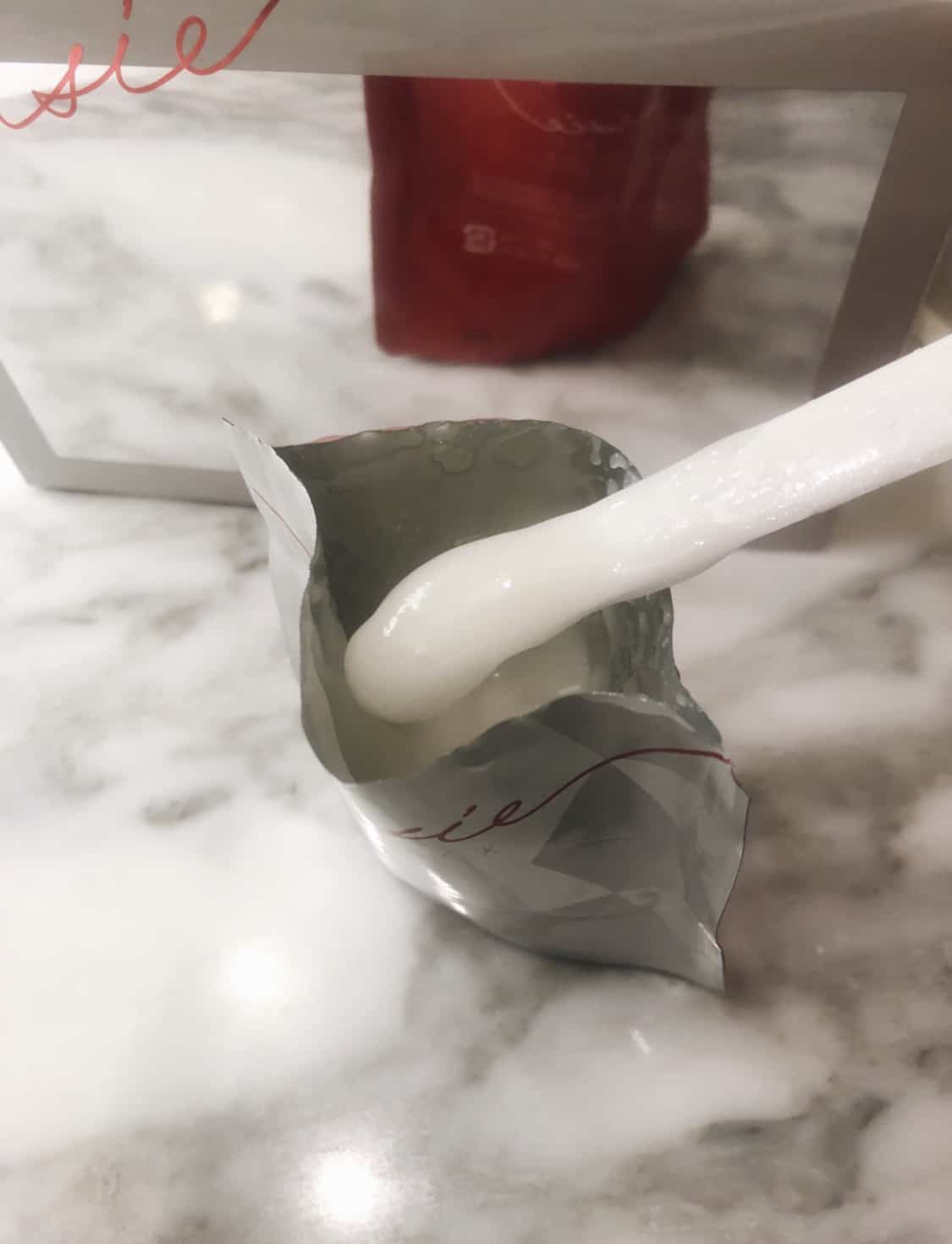 ジェルの中に、パウダーを入れてスパチュラで混ぜると炭酸パックが出来上がり、それを顔全体にのせていきます。