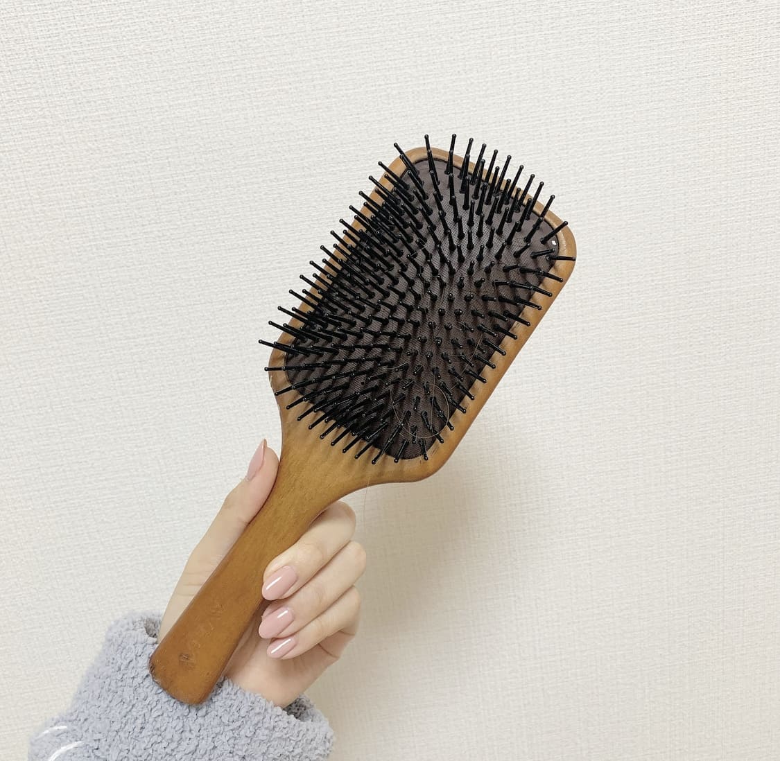 顔のケアは頭皮も大きく影響しているので、AVEDAのパドルブラシを使ってマッサージしています。