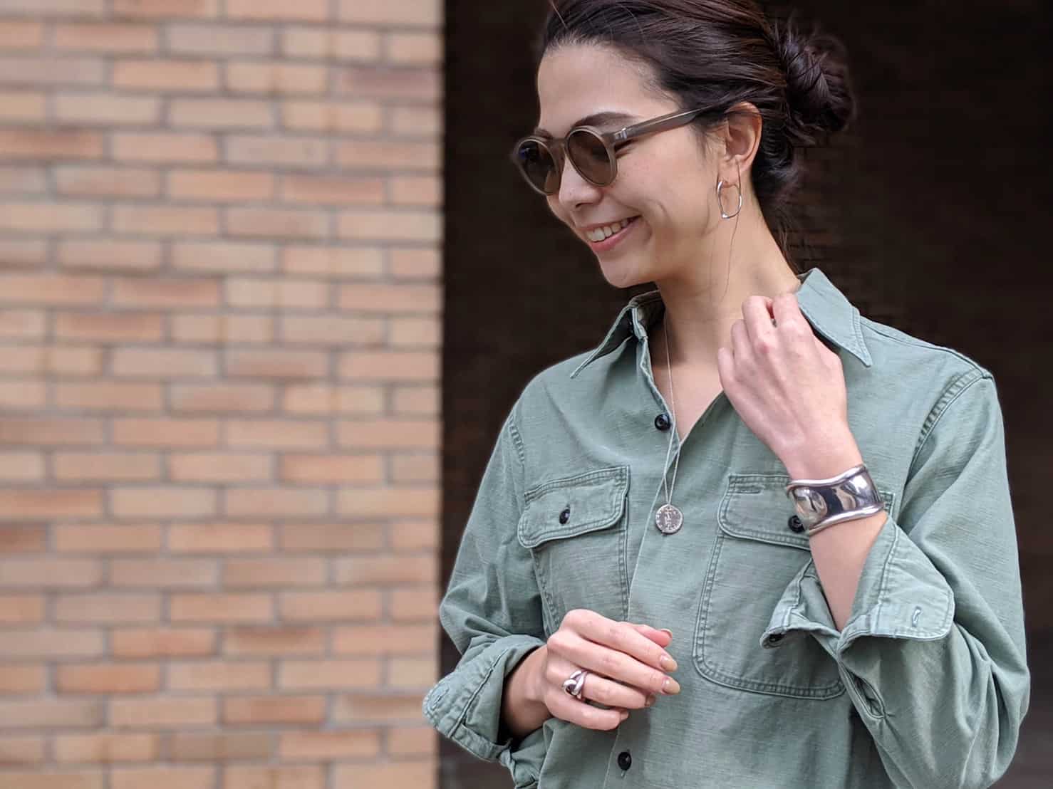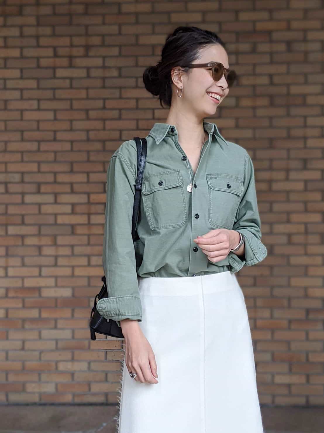 2つ目のシャツコーデは、カーキのワークシャツを合わせたスタイリングです!↓