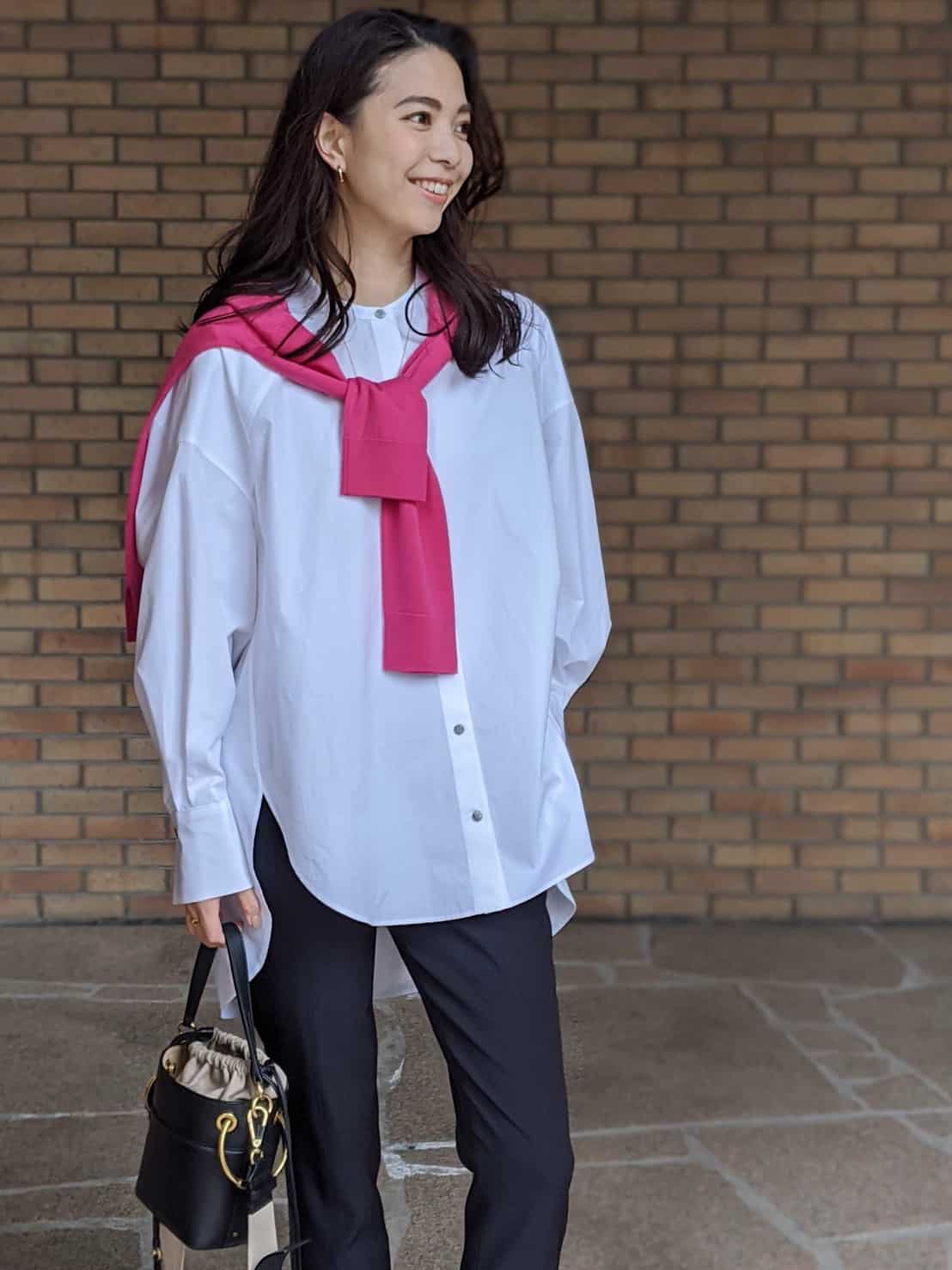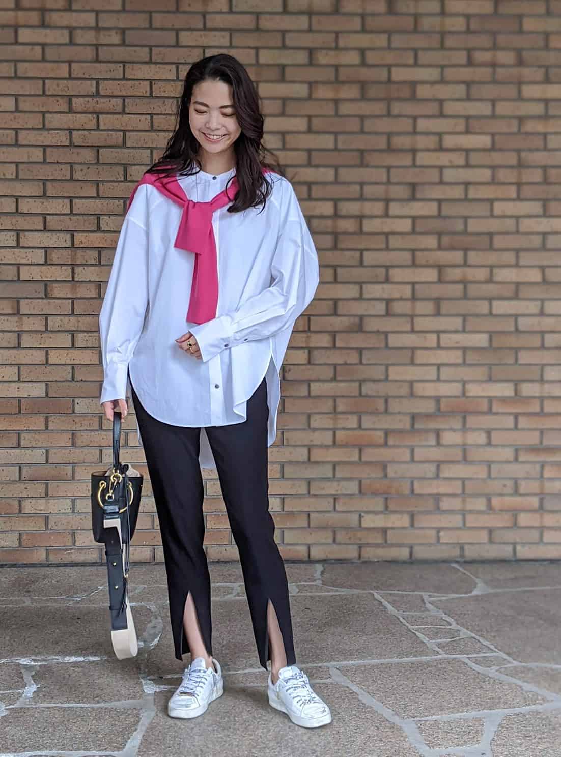 まず1つ目がオーバーサイズの白シャツを合わせたコーディネートです。↓