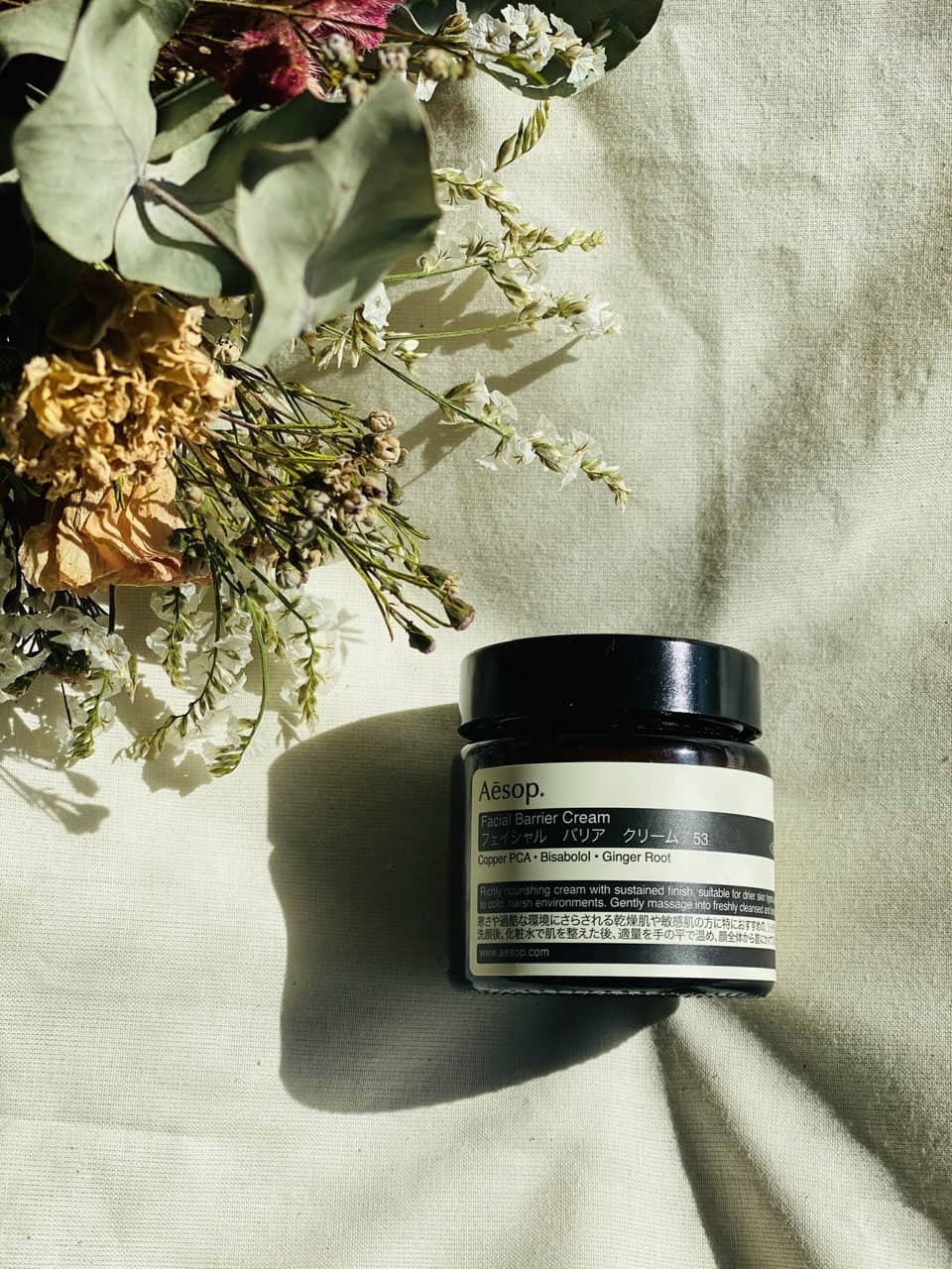 ①洗顔 ②化粧水 ③イソップのフェイシャルバリアクリームで保湿。