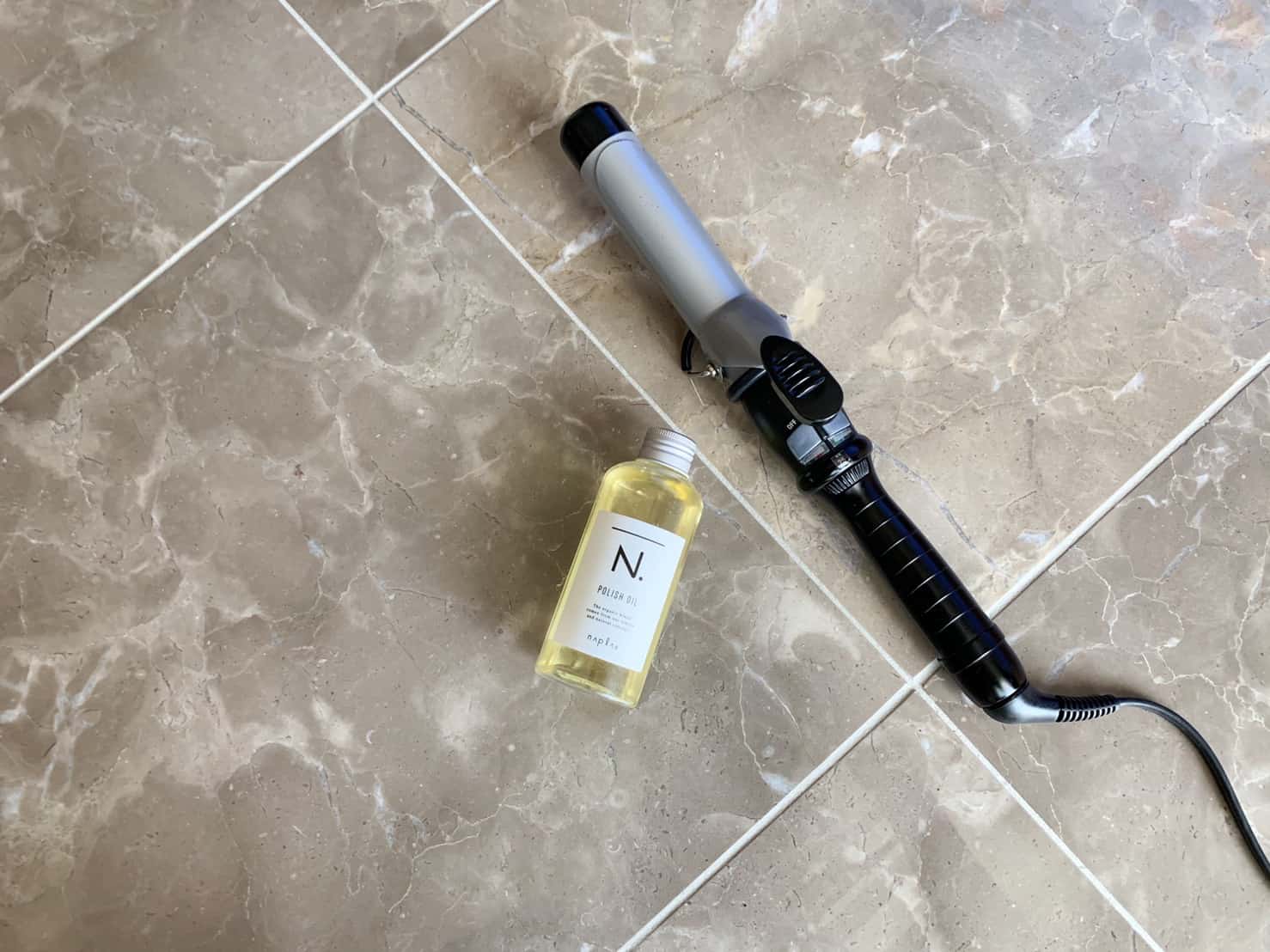 ①コテで巻く前に、ヘアオイルを4.5滴、手に出して髪全体に馴染ませます。