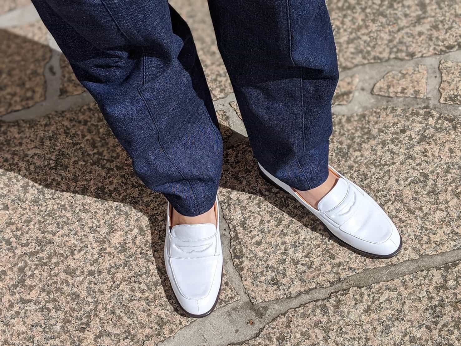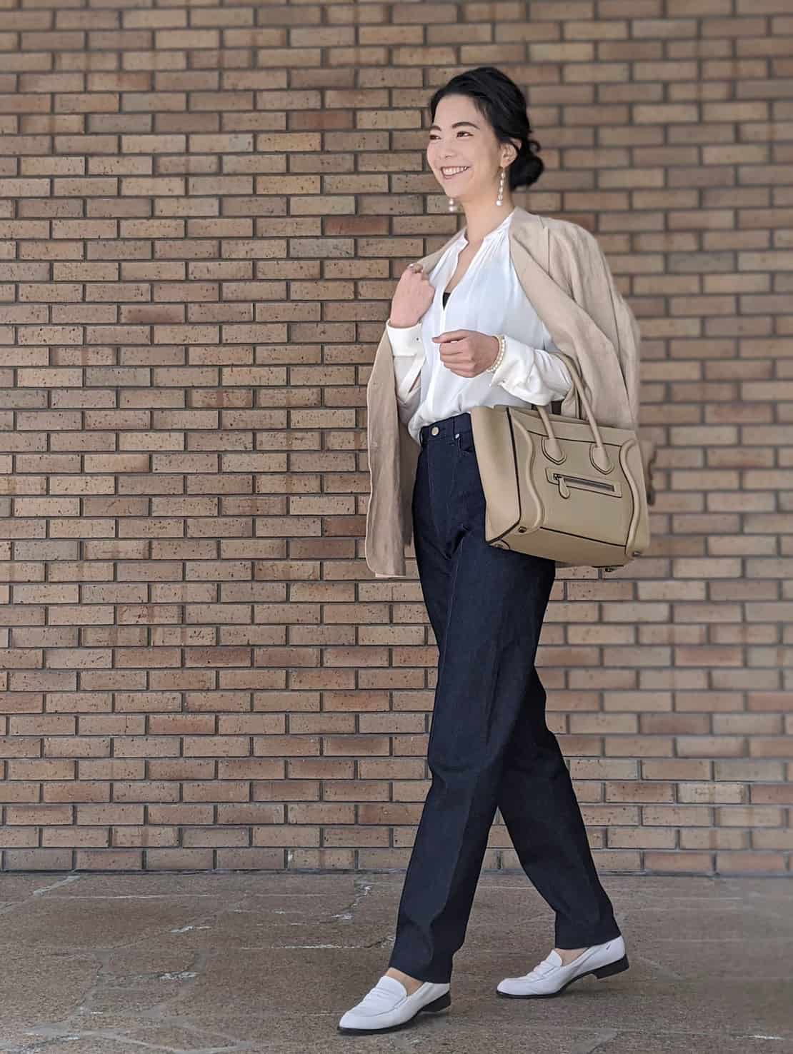 スニーカーでなく、ローファーにするだけでデニムスタイルも一気にキレイめ感がプラスになりますね。