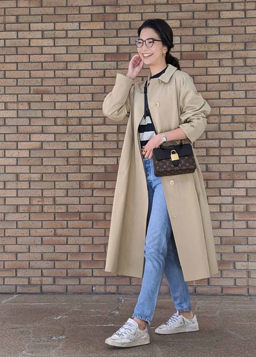 通常のダブルのトレンチコートよりもシングルの方がカジュアル見せ出来るので、オフの日にはデニムとスニーカーと合わせてぴったりです♪