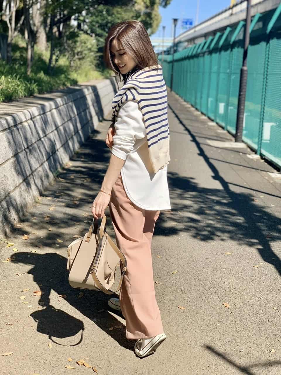 今回はダスティーピンクのキレイめパンツに白のロングTシャツを合わせてカジュアルダウンさせてみました。