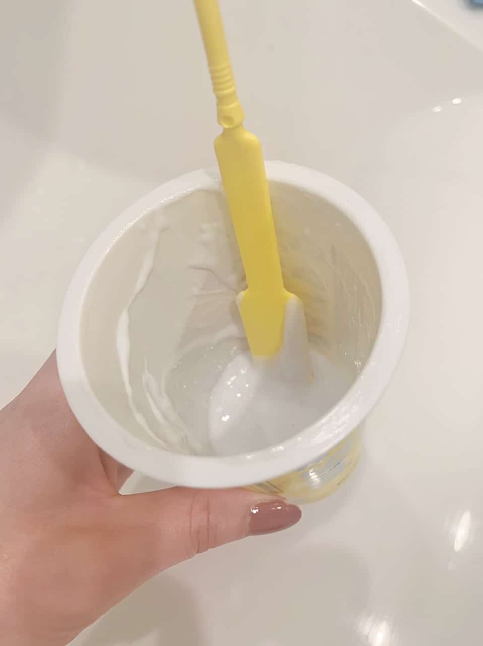 使い方は簡単で、中に2種類の液体が入ってるので、この入れ物に入れて蓋をしてシェイクしドロッとしたら、付属のスパチュラで顔に隙間なく均等にたっぷりと塗ります。そのまま20分ほど置くとスライムみたいに固まり、ぺろんと剥がせます。パック後にいつも通りのスキンケアをし保湿をしっかりして完了です。
