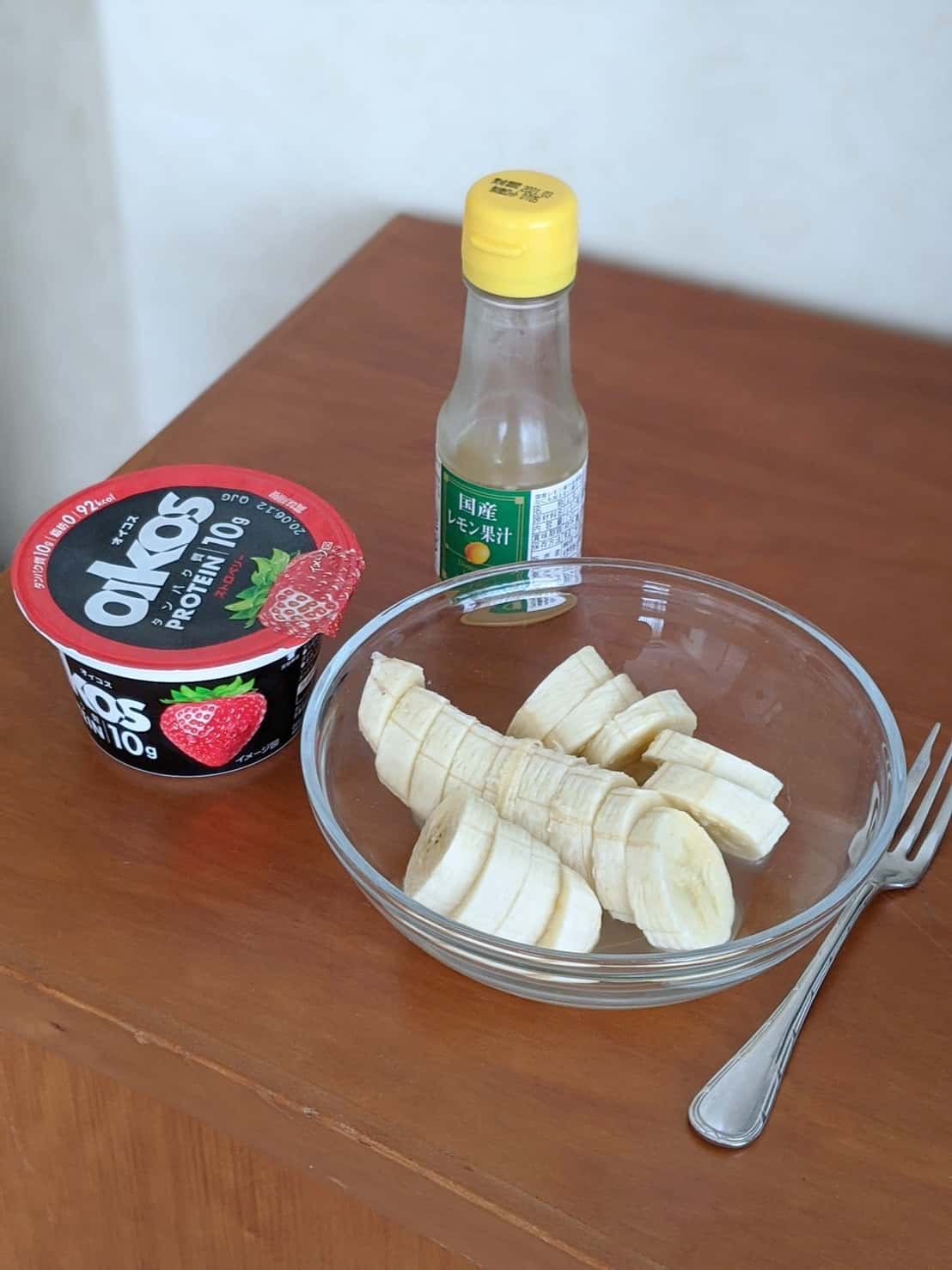 最近はバナナにレモンをかけて切って食べることがマイブーム♪ヨーグルトは最近はオイコス苺味がお気に入り!