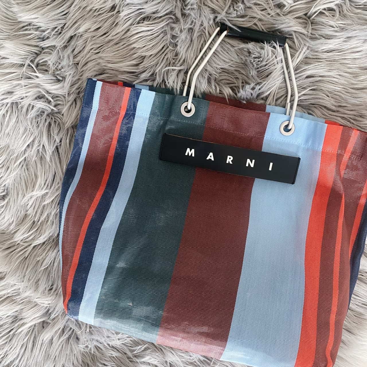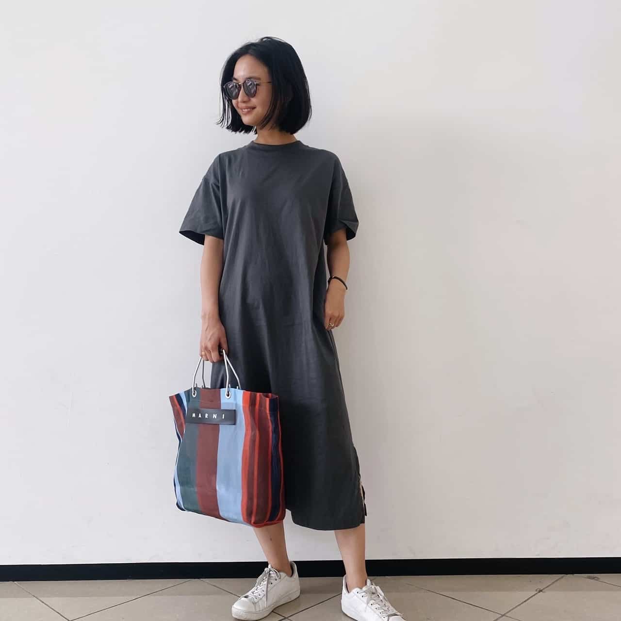 バッグは、シンプルなワンピースも映えるのMARNIのストライプバッグを合わせました。スーパーに行く時はエコバッグ代わりにもなるサイズで、とても便利です!
