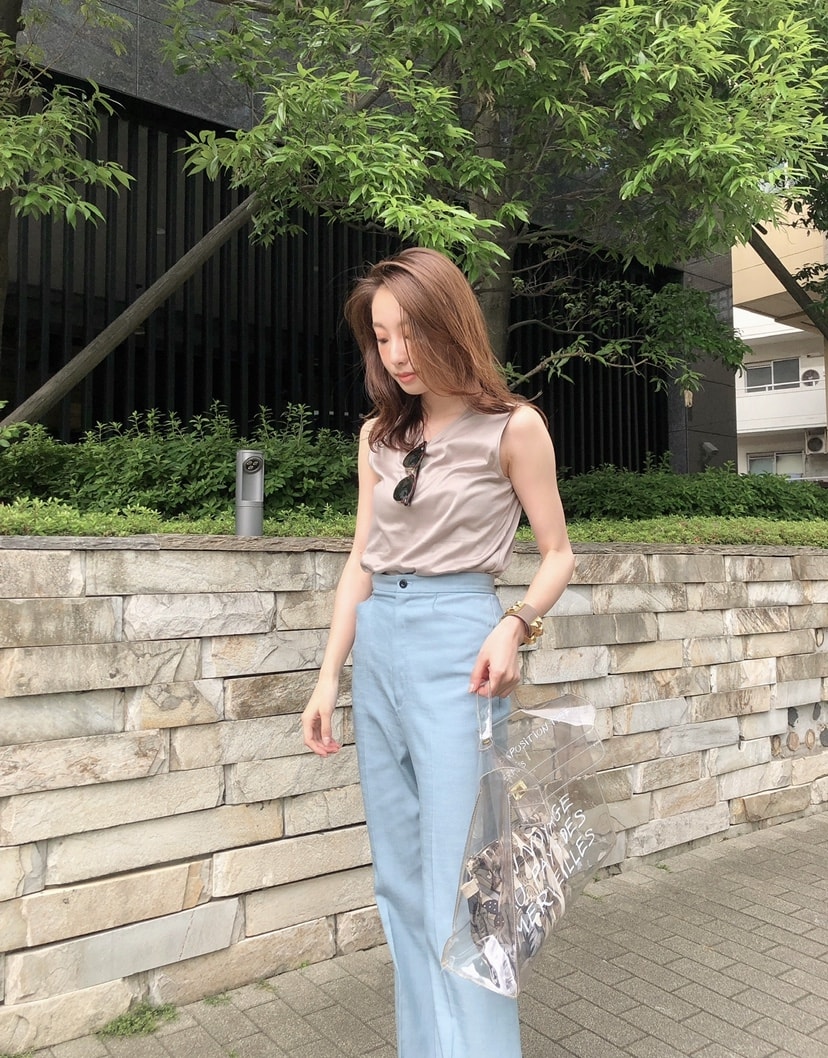 ベージュ×ライトブルーでニュアンスカラーの合わせ。クリアbagで夏らしく涼しげに。ノースリTも、てろんとした素材だときれいめに着られます。